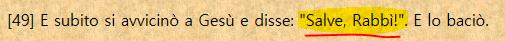 이탈리아 출신의 3명으로 구성된 그룹이 만든 작품이니 가사 역시 당연히 '이탈리아어' 이겠죠? 그래서 이탈리아어 성경을 검색해 보았습니다. (어차피 이탈리아어는 거의 모르기 때문에, 49절의 앞뒤 부분은 제외하고 인사하는 장면(Salve, Maestro에 해당하는)의 묘사만 발췌하였고, 각 성경의 판본도 설명은 생략하고 링크만 걸었습니다.)