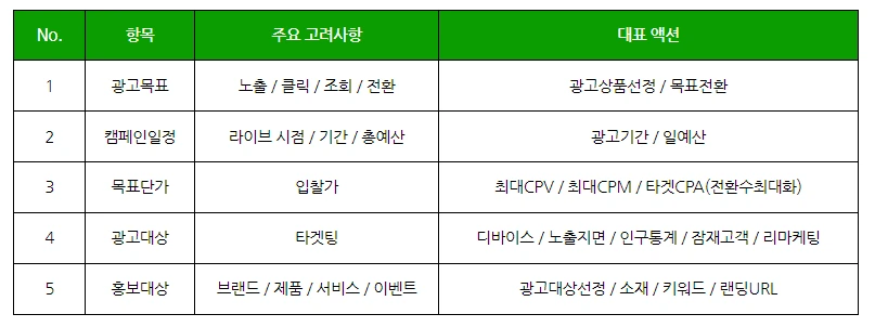 제가 지금껏 수많은 광고 캠페인을 셋팅하면서 아래의 5개항목(광고목표/캠페인일정/목표단가/광고대상/홍보대상)만 기억한다면 누구나 체계적으로 캠페인을 설계하고 최적화된 셋팅을 하실 수 있으실 겁니다.