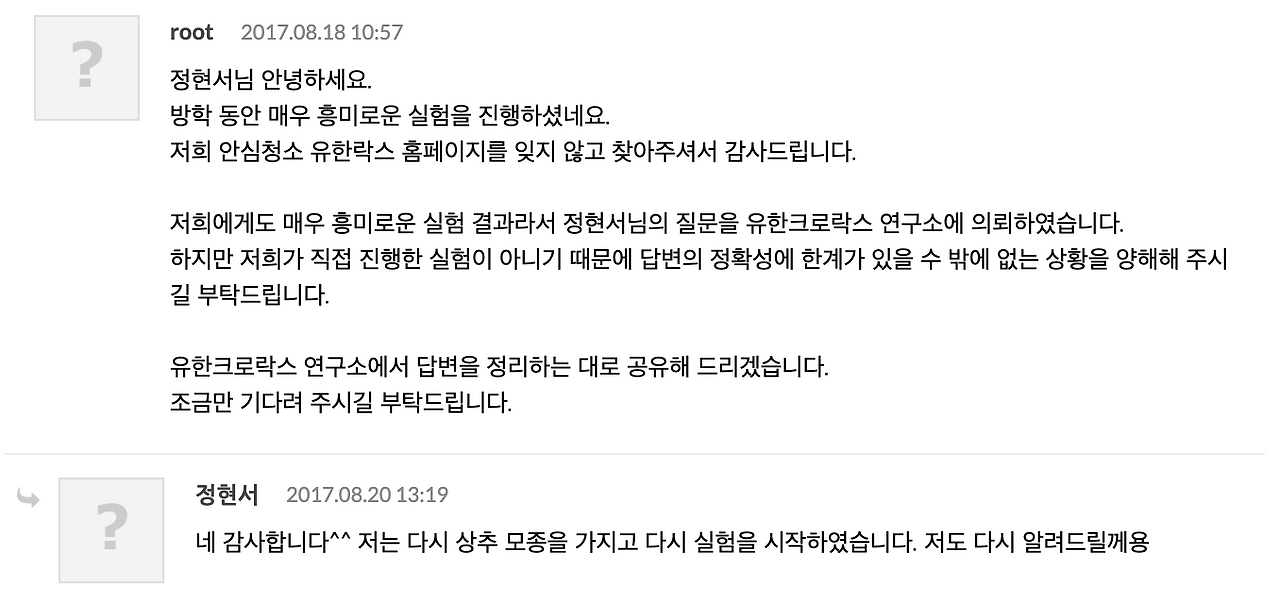 친절한 존댓말로 학생에게 예의를 갖추며 응대했고, 지금은 정확하게 모르기 때문에 아직은 답변할 수 없음에 대해 양해를 구한다. 그리고 연구소를 통해 결과를 알려드리겠다고 답한다.
