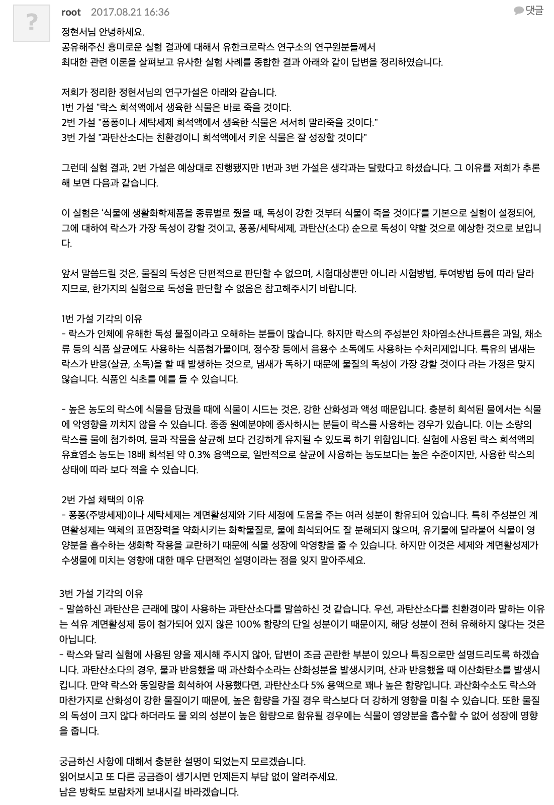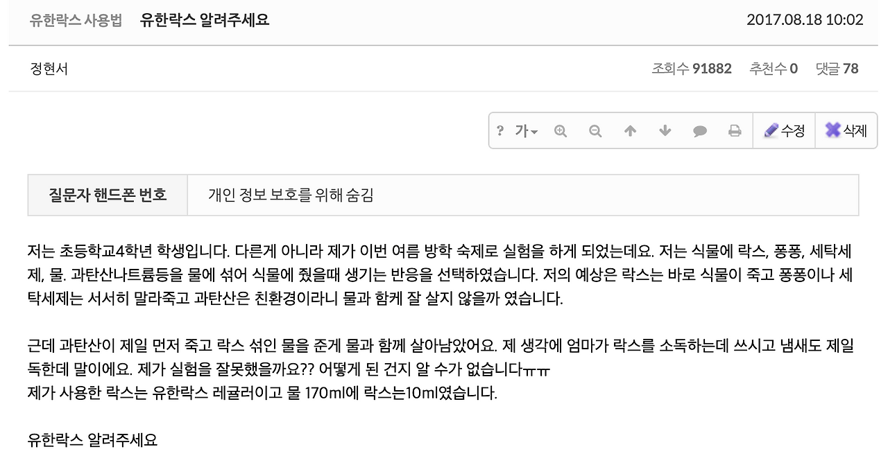 공식 홈페이지 속 질문답변 게시판 글인데 조회수가 무려 9만이 넘었던 전설의 글. 초등학교 4학년 학생이 여름 방학 숙제를 하며 궁금한 것을 물어본 글이었다. 황당해하며 누군가는 그냥 쉽게 넘길 수도 있는 질문이었지만 유한락스는 달랐다. 달라도 너무 달랐다!