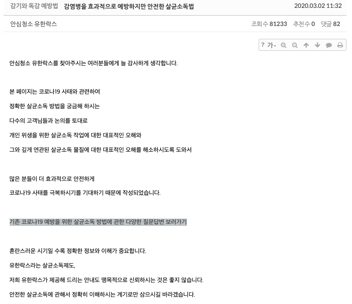 갑자기 SNS에서 유한락스의 공지사항 글이 화제가 됐다. 유한락스 공식 홈페이지 내에 정보를 알려주는 게시판에 코로나19에 대한 대처법으로 <감염병을 효과적으로 예방하지만 안전한 살균소독법>이라는 글이 올라왔기 때문이다.