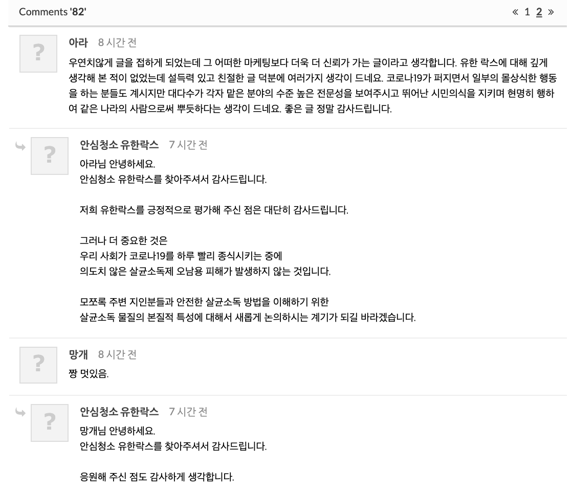 그 대답은 질문답변 게시판의 댓글을 통해 추측해볼 수 있었는데, 그것은 오해를 풀고자 했던 진심에 있었다. 좋은 제품임에도 유독성 물질이라는 비난을 받았던 유한락스. 정말 좋은 상품임을 증명하고 싶었던 직원의 진심이 결국 사람들에게 전해졌던 것이다.