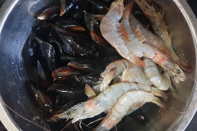 "여기 홍합도 있네, 이것도 넣어 주세요." "그럴게."