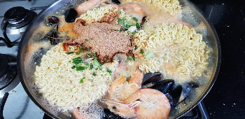 새우와 홍합을 손질하고 냄비에 물을 채우고 라면을 봉투에서 분리시켜 놓았다.