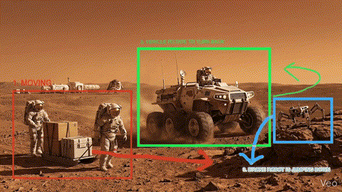 그런데 VEO3는 첫 프레임의 이미지 위에 직접 그림을 그려 움직임을 설명할 수 있게 했습니다. 움직임을 원하는 사람이나 물체에 네모 박스를 그려 대상을 지정하고 화살표를 그려 모션 방향을 지정하는 식의 프롬프팅이 가능해졌습니다. 대상의 움직임이 어떤 순서로 어떻게 움직여야 하는지 순번을 그려 넣어 지시하는 것도 가능해졌습니다.
