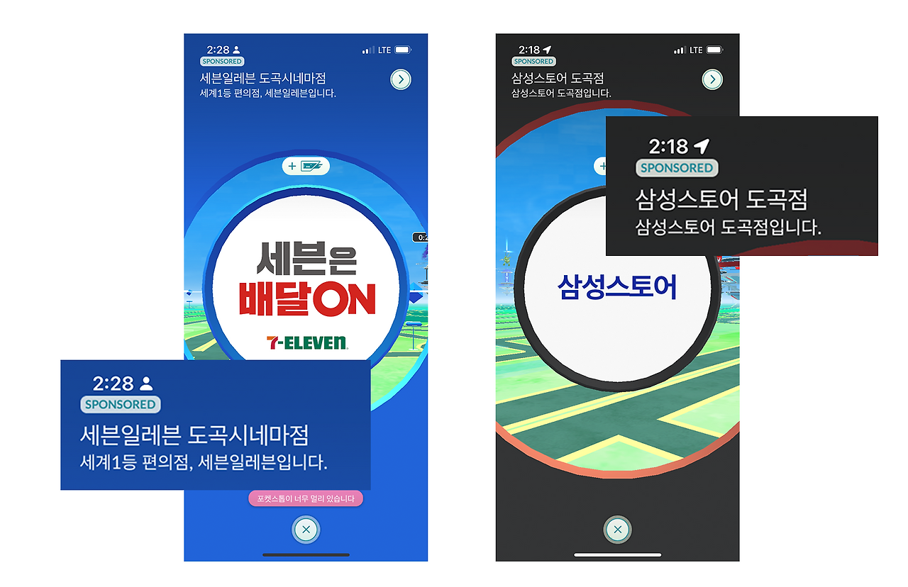 재밌게도 이런 사실을 발견하고 적극적으로 활용한 사례가 바로 편의점들이다. 국내 포켓몬고 유저들 사이에서는 편의점 특히 세븐일레븐이 공식적인 포켓스탑이었다. 세븐일레븐에 가면 포켓몬고 공식파트너 스티커가 입구에 붙어있다.