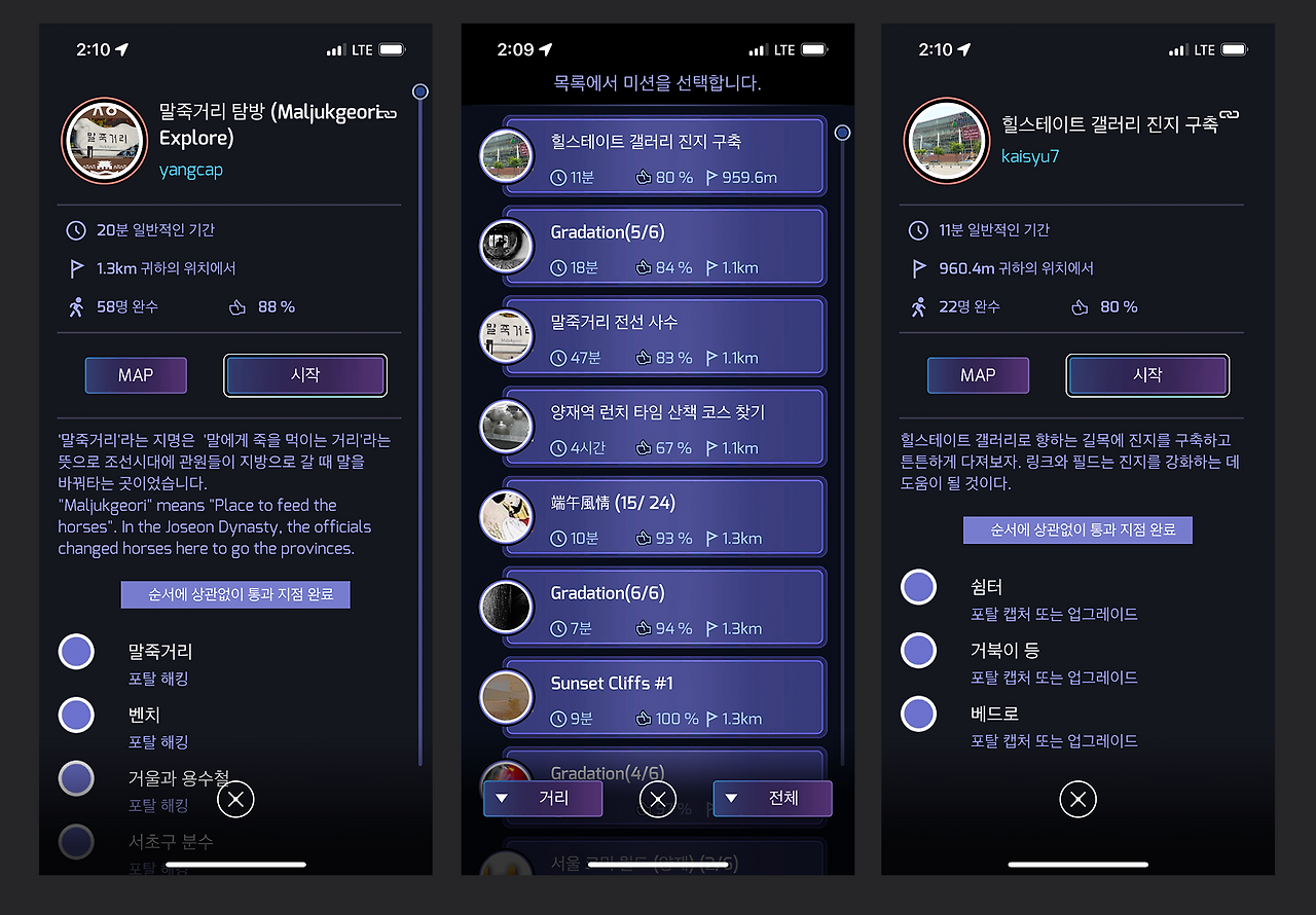 각각의 미션에는 해당 미션을 시작할 첫 번째 포탈이 내 위치에서 얼마나 떨어져 있고 해당 미션을 완수하는데, 즉 걸어서 미션 포탈을 방문하는데 시간이 얼마나 소요되는지 표시가 되어 있다. 또 몇 명이나 참여했으며 얼마나 만족스러웠는지 후기 점수도 표시되어 있어 자유롭게 마음에 드는 미션을 골라 수행할 수 있다. 마치 산에 오르기 전 여러 등산 코스 중 하나를 고르는 것과 같은 재미가 있다.