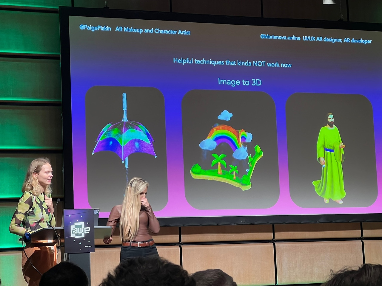완전히 생성형 AI만을 활용해 3D어셋을 생성하고 10여 종의 AI 서비스를 조합해 하루 만에 스냅챗용 얼굴 인식 필터를 만든 사례가 굉장히 인상적이었다. 보기에는 멋지고 트렌디한 프로젝트 발표였지만 내가 디자이너 혹은 3D모델러로서 AI로 원하는 결과물이 나올 때까지 프롬프트를 다시 쓰는 시간에 직접 모델링하는 것이 빠르고 정확하고 아름답겠다는 생각이 강하게 들었다. 그리고 결국 AI를 조합하는 것과 그 결과물들을 구성하는 것은 아티스트의 기존 매체에 대한 숙련도, 개인 역량에 달려있다. 생성형 AI는 유용하지만 혹할 필요는 없다.