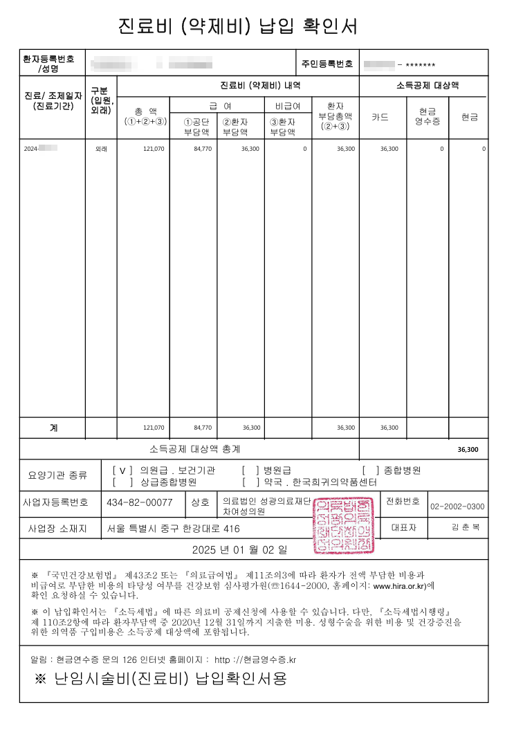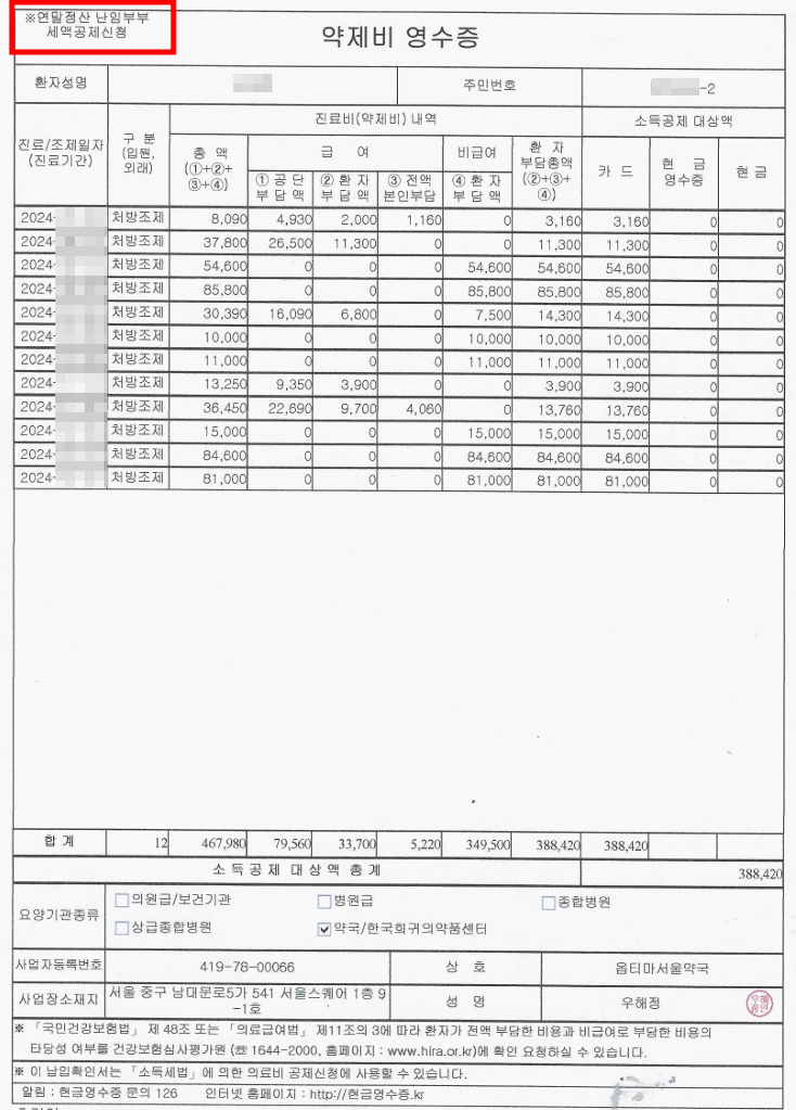 그리고 난임 시술비에는 약값도 포함된다고 해요. 약국에서도 신분증을 제출하고 연말정산용 서류를 요청하면 '연말정산 난임부부 세액공제신청' 문구가 기재된 서류를 받을 수 있습니다. 주민번호 뒷자리가 맨 앞 한자리만 기재되었길래 약사님께 물어봤더니 원래 이렇게 발급이 된다고 하네요.
