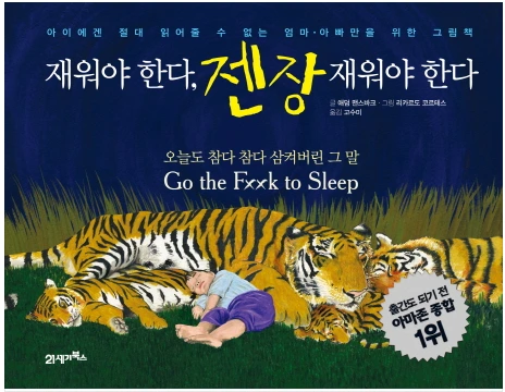 이 책의 원 제목은 ‘All Joy and No Fun’, -모든 게 기쁨, 그러나 재미는 전혀 없음-이라고 한다. 그런데 출간된 그림책의 제목은 <Go the F**k to Sleep>이다. 그림책에 표지 재목 F와 k 중앙에 동그란 하얀 달이 영어의 비속어 Fok의 ‘o’를 대신해 그려져 있다.