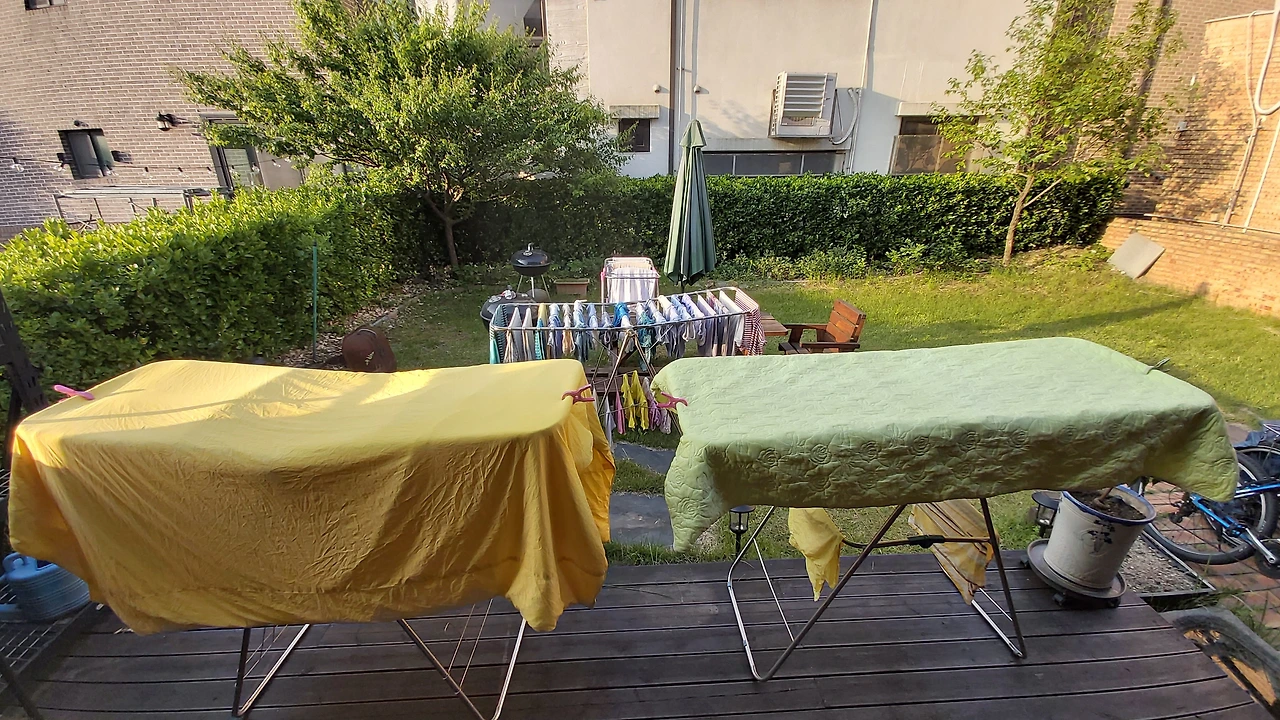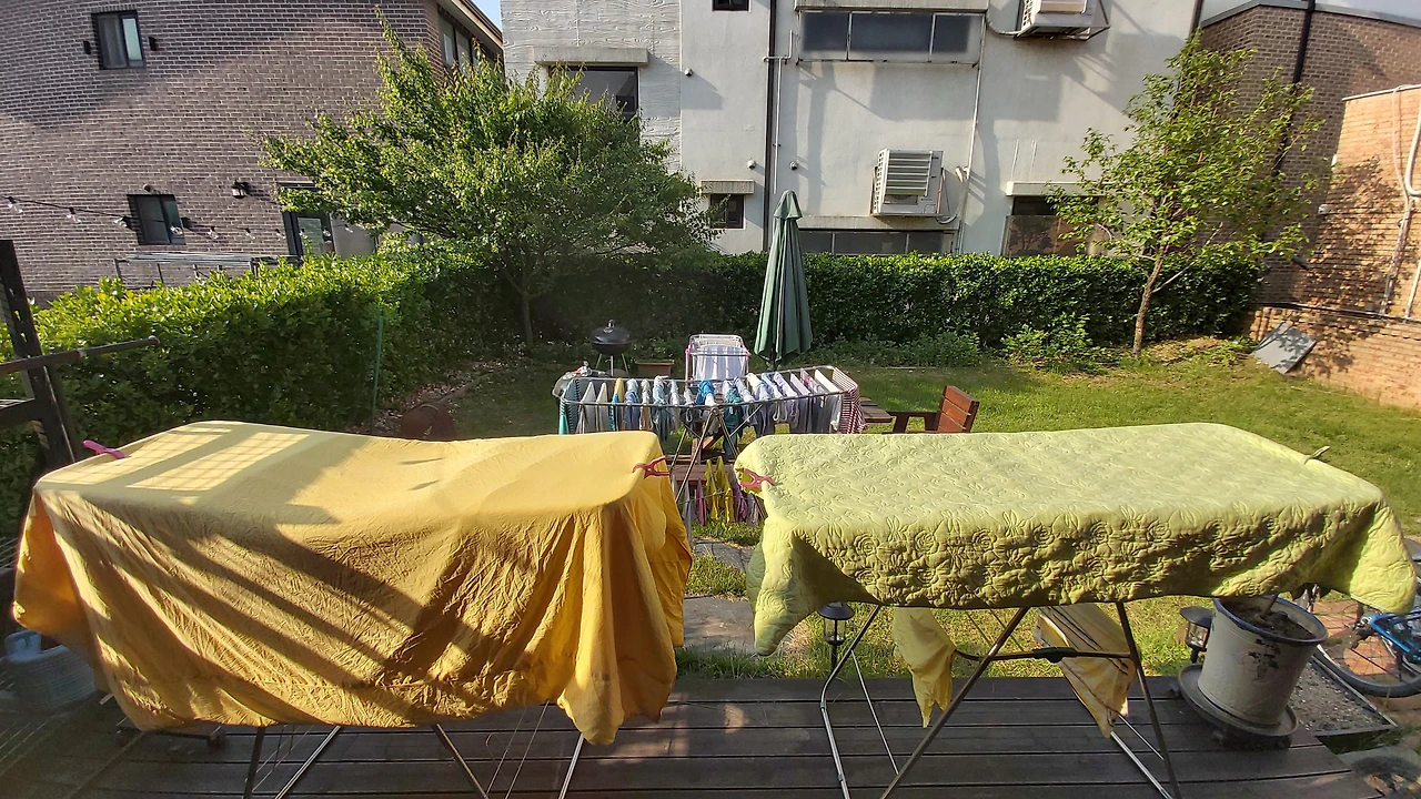 그렇게 내어 놓았지만, 데크가 좁다. 과감히 마당 잔디밭에 내려놓고 이불을 꺼내온다. 건조대 두 개에 나란히 걸어 놓으니 마당 한 가득이다. 슬슬 해가 들어온다. 동쪽에서 들어오는 햇빛이 남쪽, 서쪽을 지나면서 빨래를 구석구석 ‘튀겨’ 줄 것을 생각하니 입가에 미소가 뗘진다.