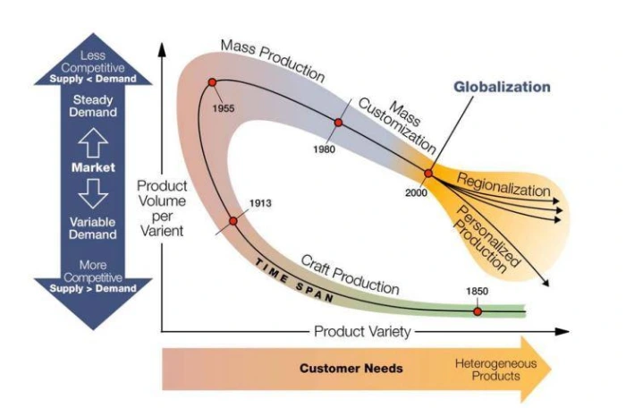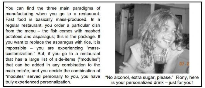 Fast food 식당에서는 주문 리스트에서 선택된 음식에서 더하거나 덜하지 못하는 제한된 주문만 가능하지만 다양한 메뉴를 보유한 식당에서는 고객의 요구에 다양한 음식 조합(modules)으로 주문자의 다양한 수요를 만족시킬 수 있습니다. 이러한 예시처럼 다양한 고객의 요구를 만족시킬 수 있는 personalized manufacturing 방식으로 변화될 것입니다.