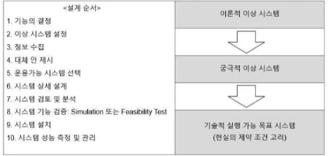 이상적이지만 달성 가능한 목표 시스템을 구현할 수 있기 위해서는 ① 목표 기능을 결정하고, ② 분석을 위한 정보 수집과 ③ 대체 가능한 대안을 제시하는 과정에서 ④ 상세 설계 및 선행 실험 분석이 필요하고 ⑤ 시스템 결과에 대한 성능을 측정하여 목표 수준의 달성 여부를 분석하고 관리해 가는 과정이다.