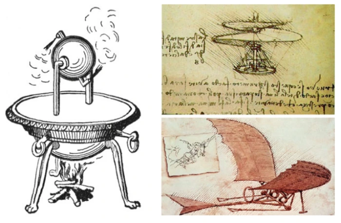 Eolipyle from Heron of Alexandria and concepts of helicopter and plane by Leonardo DaVinci