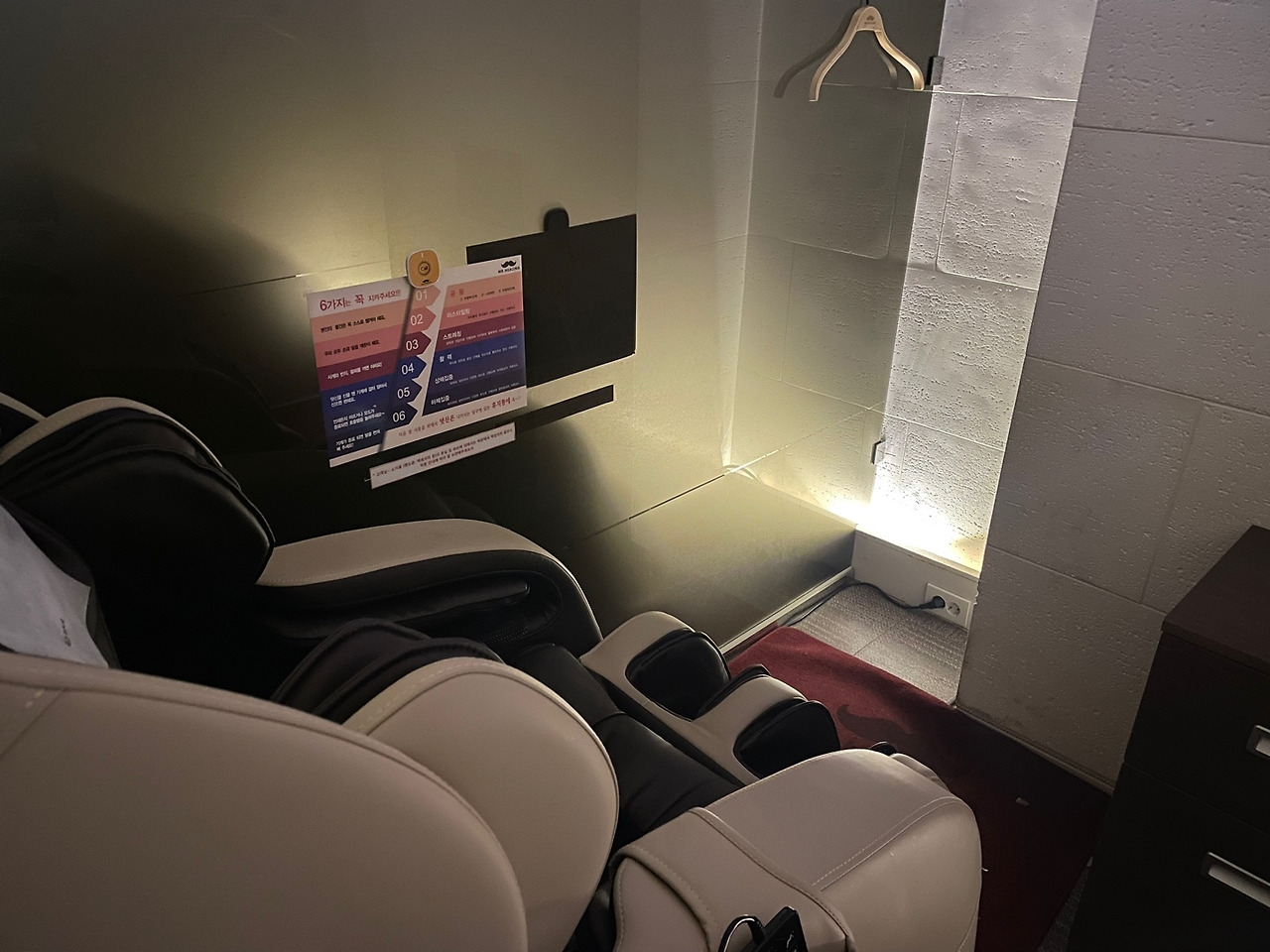 피곤한 상태였기 때문에 마사지만 받고 집으로 갈 생각뿐이었다. 주인을 따라갔다. 무거운 커튼이 열렸다. 어두운 곳으로 들어갔다. 여러 개의 칸막이기 보였다. 칸막이마다 안마의자가 2개씩 배치되어 있었다. 나 말고도 다른 사람들이 있는지 말소리가 들렸다.
