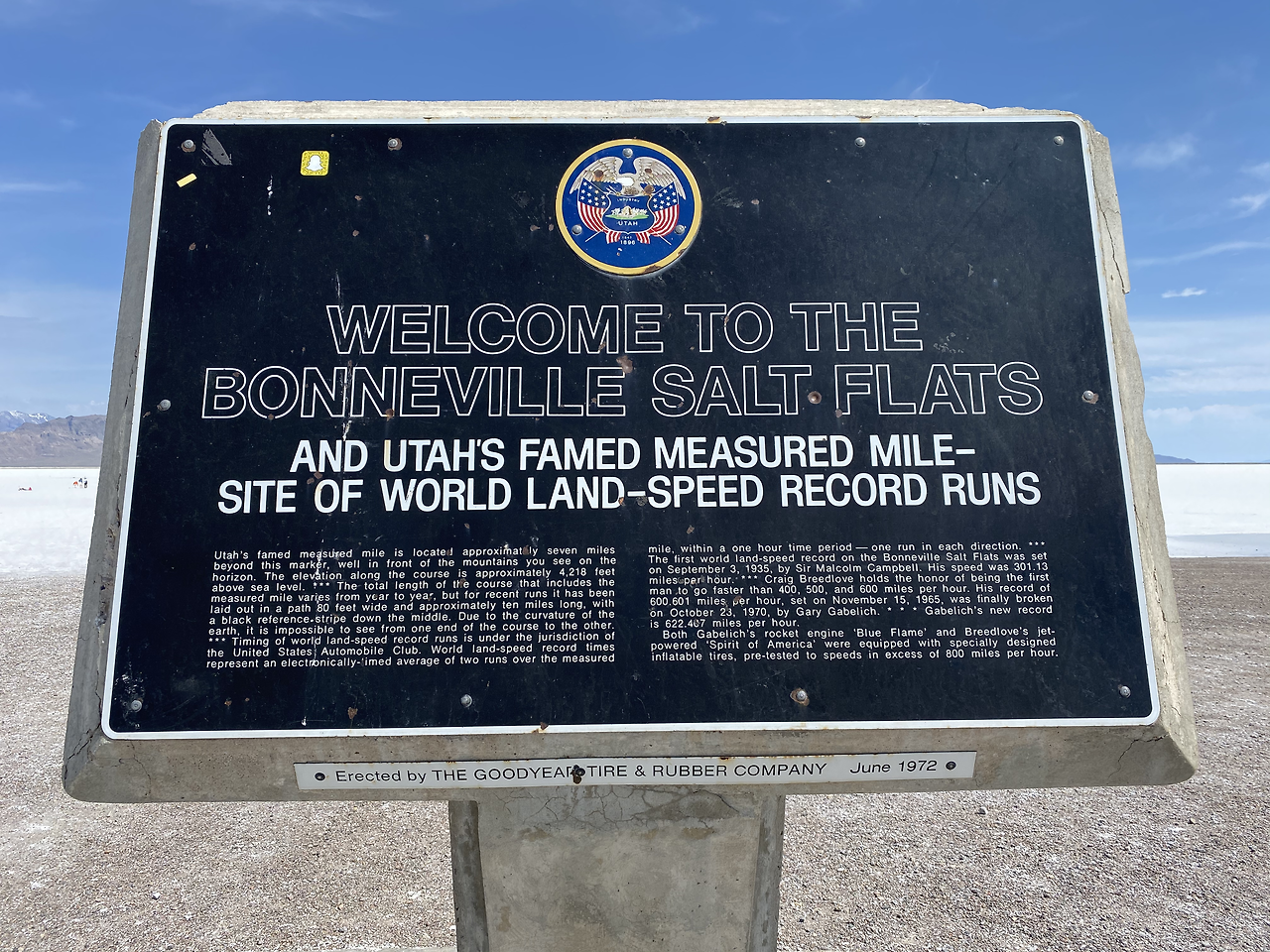 보네빌 소금 평원(Bonneville Salt Flats)은 네바다 주 접경과 가까운 유타 주 북서부에 위치한다. 1830년대 서부를 탐험한 미군 장교 벤자민 보네빌(Benjamin Bonneville)의 이름을 따서 이름을 붙였다. 보네빌 호수는 약 1만년 전 까지 미국 유타주, 네바다주, 아이다호주에 걸쳐 존재했던 거대 밀물 호수지만 물은 증발하고 소금만 남아 현재의 소금 평원을 만들었다. 솔트레이크 시티의 그레이트 솔트 레이크는 보네빌 호수가 증발해 소멸하는 과정에서 남아있는 잔여물이라니 만년 전 그 호수가 얼마나 컸을지 상상이 간다.