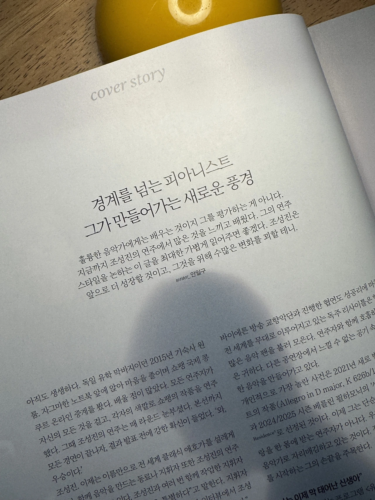 조성진은 피아니스트로서, 음악의 무한한 가능성을 탐구하고 그것을 경이로운 방식으로 실현해내는 연주자다. 스스로 무대 위에서 이를 증명하고 있다. 그의 연주는 단순히 기술적인 완벽함을 넘어, 음악이 가진 깊이와 감정을 온전히 담아낸다. 그가 연주하는 순간, 우리는 음표 너머의 풍경을 보고, 음악의 본질을 느낄 수 있다. 그는 여전히 성장하고 있으며, 언제나 새로운 도전과 변화에 열린 마음을 가지고 있다. 조성진이 앞으로 어떤 음악의 바다를 항해할지, 그 끝에 펼쳐질 새로운 풍경이 기대된다.