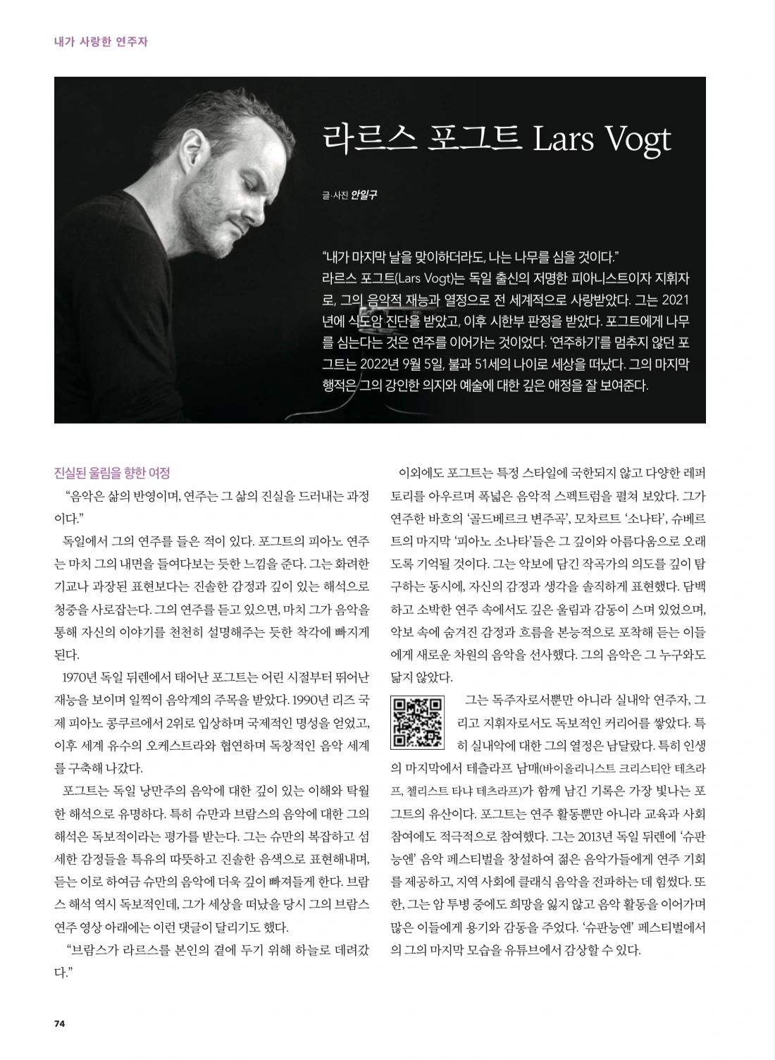 독일에서 그의 연주를 들은 적이 있다. 라르스 포그트의 피아노 연주는 마치 그의 내면을 들여다보는 듯한 느낌을 준다. 그는 화려한 기교나 과장된 표현보다는 진솔한 감정과 깊이 있는 해석으로 청중을 사로잡는다. 그의 연주를 듣고 있으면, 마치 그가 음악을 통해 자신의 이야기를 천천히 설명해 주는 듯한 착각에 빠지게 된다.