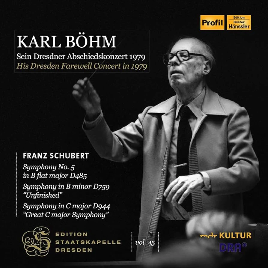 칼 뵘과 드레스덴 슈타츠카펠레가 함께 한 1979년 '굿바이콘서트'가 음반으로 남아있다. 칼 뵘은 20세기 클래식 음악사의 거대한 기둥이었다. 그는 베토벤, 모차르트, 슈베르트, 브람스, 바그너, 슈트라우스 등 자신이 손댄 거의 모든 레퍼토리에서 압도적 해석을 남겼다. 모차르트, 베토벤 해석은 ‘교과서’라 불릴 만큼 정통성을 가졌고, 바그너나 슈트라우스 해석은 오페라와 관현악 레퍼토리에 새로운 영혼를 불어넣었다. 칼 뵘 특유의 음악은 엄격하면서도 자연스러운 흐름을 지닌다. 군더더기 없는 정확함 속에서도 드라마틱한 긴장이 함께 만들어진다. 그의 지휘 아래 울려 퍼진 사운드는 세월이 지나도 여전히 최고의 기록으로 기억된다.