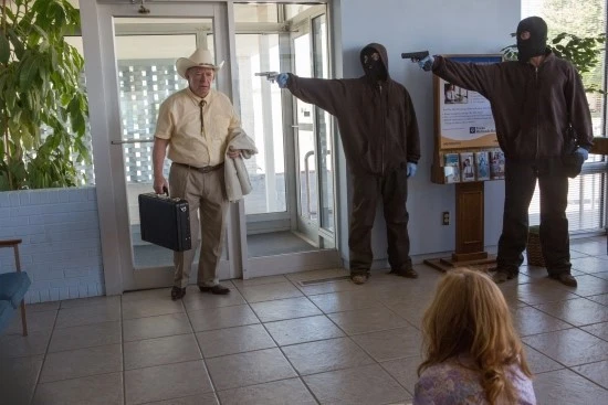 텍사스의 거친 모래바람이 걷히면 정적만이 가득하다. 뜨거운 아스팔트 위에서 조명하는 삶은 무기력하게 느껴진다. 도입부에 나타나듯이 대출과 채무 구제를 광고하는 팻말 너머에는 거대한 석유 펌프가 즐비하다. 같은 곳에서 누군가는 없는 돈을 쫓고 누군가는 굴러오는 돈을 잡는다. 그렇게 형체를 알 수 없는 거대자본의 그림자는 비루한 개인의 삶을 잠식하기에 바쁘다. 그리고 시대를 개탄하며 분노를 머금은 사람들의 아우성은 한낱 낡은 벽에 칠해진 낙서에 불과하다. 낡아버린 건물에는 실로 처절한 현실만 존재한다. 그때 홀연히 들려오는 강도 소리는 극의 자연스러운 변주를 매개한다.