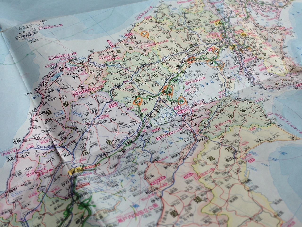 가져온 일본 전도를 펼치고 가야 할 길을 다시금 확인하였다. 한국에서 여행 출발 전날 밤, 목적지를 펜으로 표시를 해두었다. 도시를 기점으로 체크한 대략적인 위치다.
