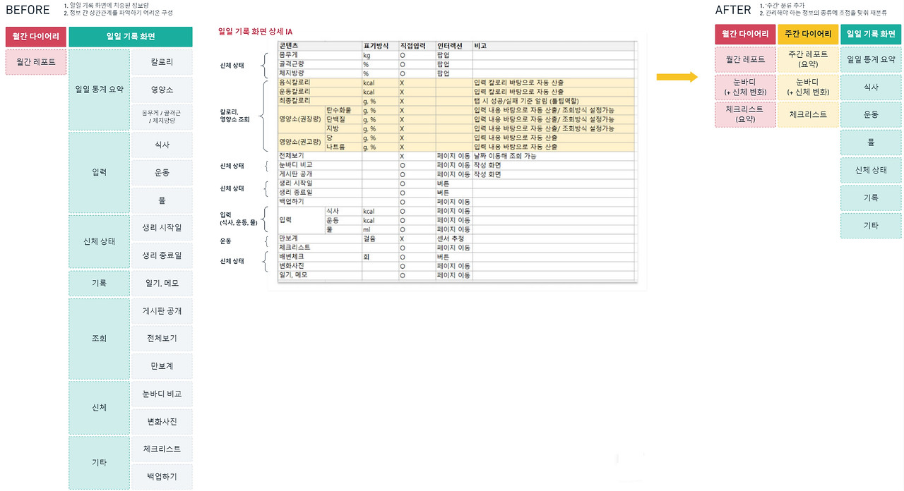 다양한 방법이 있겠지만 여기에서는 두 가지 방식을 활용해 다이어리를 좀 더 체계화하였다. 첫째, 주간 다이어리를 추가해 IA를 1차로 월 - 주 - 일로 세분화했다. 둘째, 일간 다이어리에서 관리해야 하는 정보를 신체 - 식단 - 운동 - 물의 4가지로 재분류했다. 입력과 조회 화면을 구분하는 대신 입력하는 동시에 한눈에 현황을 볼 수 있도록 화면을 설계할 수 있도록 했다.