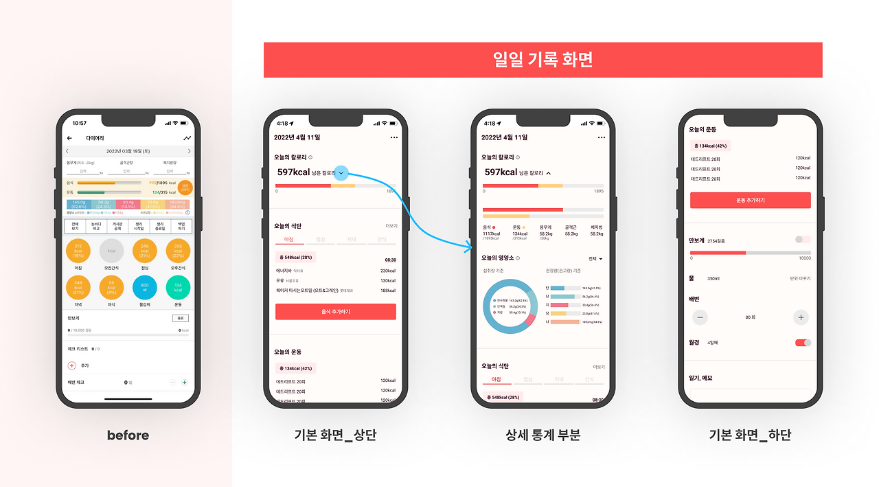또한, 정보를 식단 - 운동 - 물 - 신체로 나누어 차례대로 나열했다. 식단의 경우 탭 UI를 활용해 식단을 재분류하고 아침-점심-저녁 간식으로 나뉘어 있던 간식을 하나로 합쳐 메뉴를 간소화하면서도 먹은 음식을 한눈에 볼 수 있도록 설계했다. 그 아래 배변이나 월경 등 신체 상태를 체크하는 UI들은 보다 일반적인 멘탈모델에 맞게끔 UI 입력 방식을 수정하였으며, 손으로 터치하기 쉽도록 전반적인 크기를 키웠다. 그리고 가장 아래 일기나 메모를 적은 내용을 배치해 전체 현황 조회를 위한 별도의 버튼 UI가 필요하지 않도록 수정하였다.
