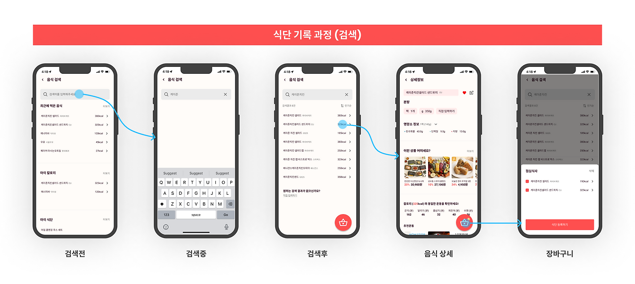 검색 과정에서의 사용성을 개선하기 위해 다음과 같은 점들을 수정했다. 첫째, 검색 화면을 활용해 '최근에 먹은 음식'과 '마이 칼로리', '마이 식단'을 아예 앞으로 빼어 원하는 음식을 검색하기 전 다른 방식으로도 식단을 기록할 수 있는 방안을 보다 더 직접적으로 제공했다. 둘째, 검색 후에는 원하는 음식을 선택하기 편하도록 요소 크기를 키우고 전반적인 간격을 넓혀 가독성을 높이려 했다(예를 들어, 애플의 human intercafe design 가이드라인은 요소의 최소 규격을 44pt로 잡고 있다). 세 번째로는 온라인 쇼핑몰의 장바구니 기능처럼 선택한 음식을 잠시 담아둘 수 있는 공간을 만들었다. 이로써 음식을 하나씩 등록하고 수정하려 할 때마다 식단 기록 페이지로 돌아가야만 하는 번거로움이 줄어들게 되었다.