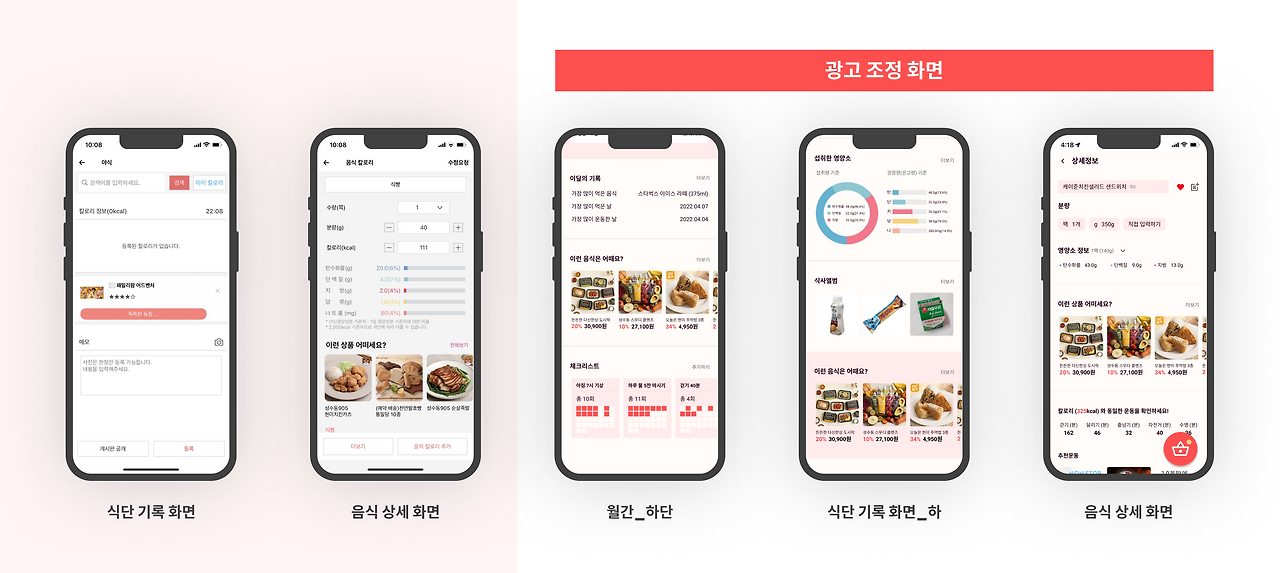 식단 등록 과정에서 광고가 적용되는 부분은 식단 등록 화면과 음식 상세 정보를 제시하는 화면 두 곳이었다. 이곳들이 다이어트신에서 판단한 '광고 시 효과가 좋은 페이지/위치'라는 가정을 해보면 좋을 것 같다. 이 위치에 앱 설치 광고 대신 자사몰 '다신샵'의 제품을 추천해 주는 것은 어떨까? 그렇다면 사용자가 광고에 갖는 거부감을 최대한 낮출 수 있을 것이라고 생각했다.