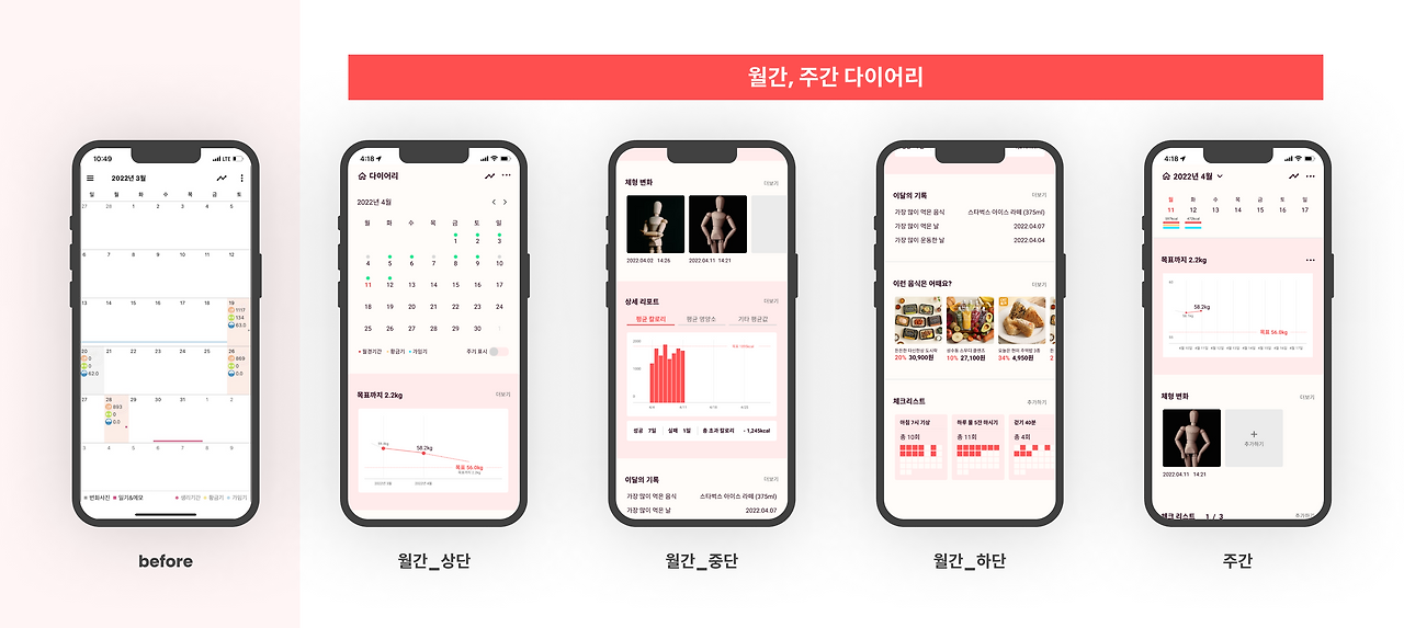 또한 체크리스트, 눈바디 사진(신체 변화 사진)과 같이 매일 입력하지는 않지만 주기적으로 관리해주어야 하는 정보들을 주간 다이어리 항목으로 분산하였다. 그와 동시에 주간 리포트를 추가했는데, 몸무게와 같이 월간보다 자주 확인하고 싶을 것이라 예상되는 항목을 요약 제시해 유용성을 한층 높이고자 한 것이다.