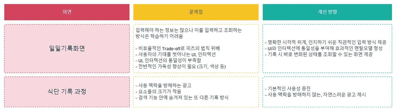 저번 글에서는 다이어리 기능이 사용하기 불편한 이유와 개선 방향을 알아보았다. 일일 기록 화면에서는 입력해야 하는 정보는 많으나 이를 어떻게 입력하고 조회할 수 있는지 쉽게 파악하기 어렵다는 점, 식단 기록 과정에서는 낮은 사용성과 맥락에 맞지 않은 광고로 인해 불편함을 겪는다는 점을 발견할 수 있었다. 이번 글에서는 이를 바탕으로 한 구체적인 변경안을 제언하고자 한다.