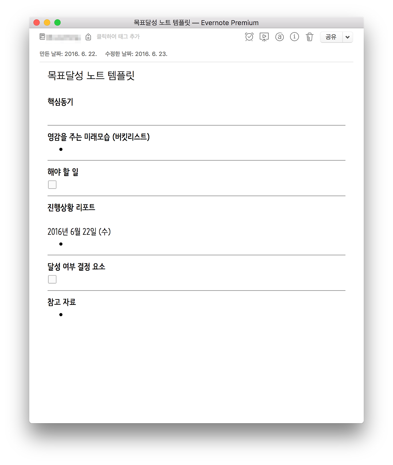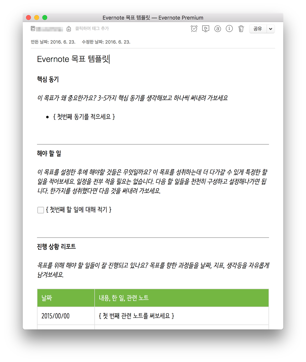 첫 번째 에버노트에서 제공해주는 템플릿이고 두 번째 것이 내가 보완한 템플릿이다.