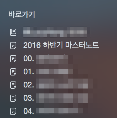 블로그에서는 '검색폴더'를 만들어 바로가기에 추가했는데 그런 과정 없이 모든 노트를 바로가기에 추가해 두었다. 마스터노트를 맨 위에 두고 나머지 노트들을 순서대로 바로가기에 붙여둔 이유는 아무래도 자주 눈에 띄고, 들락날락 거리는 것이 목표 성취에 도움이 될 것 같아서 그리 했다.