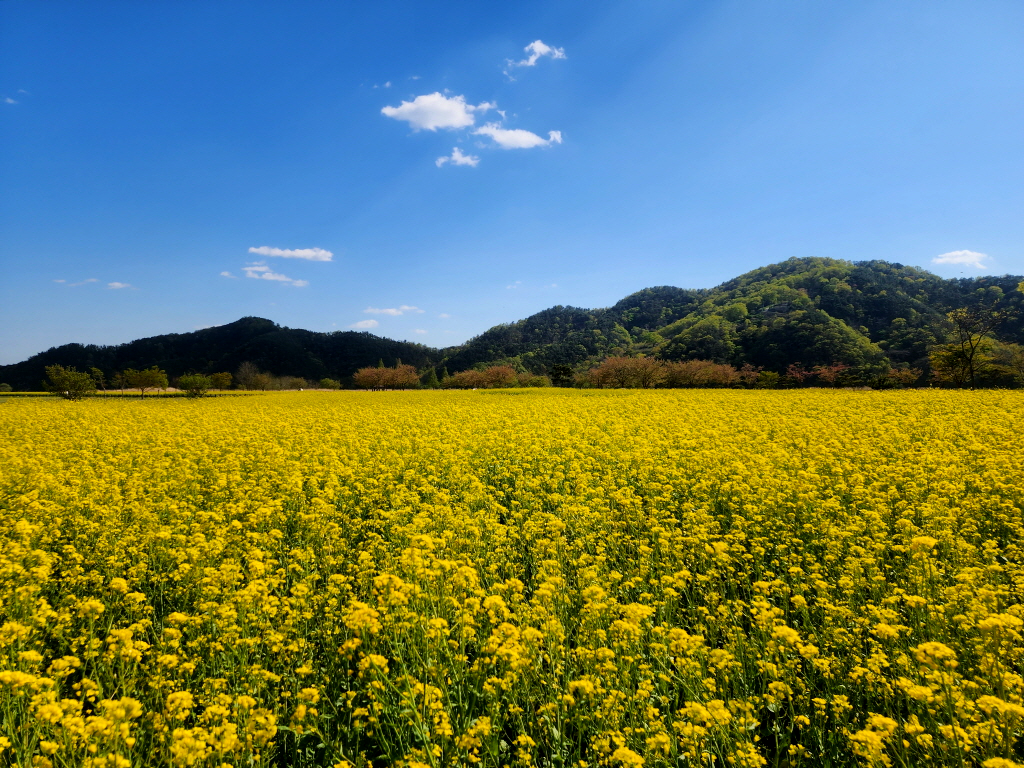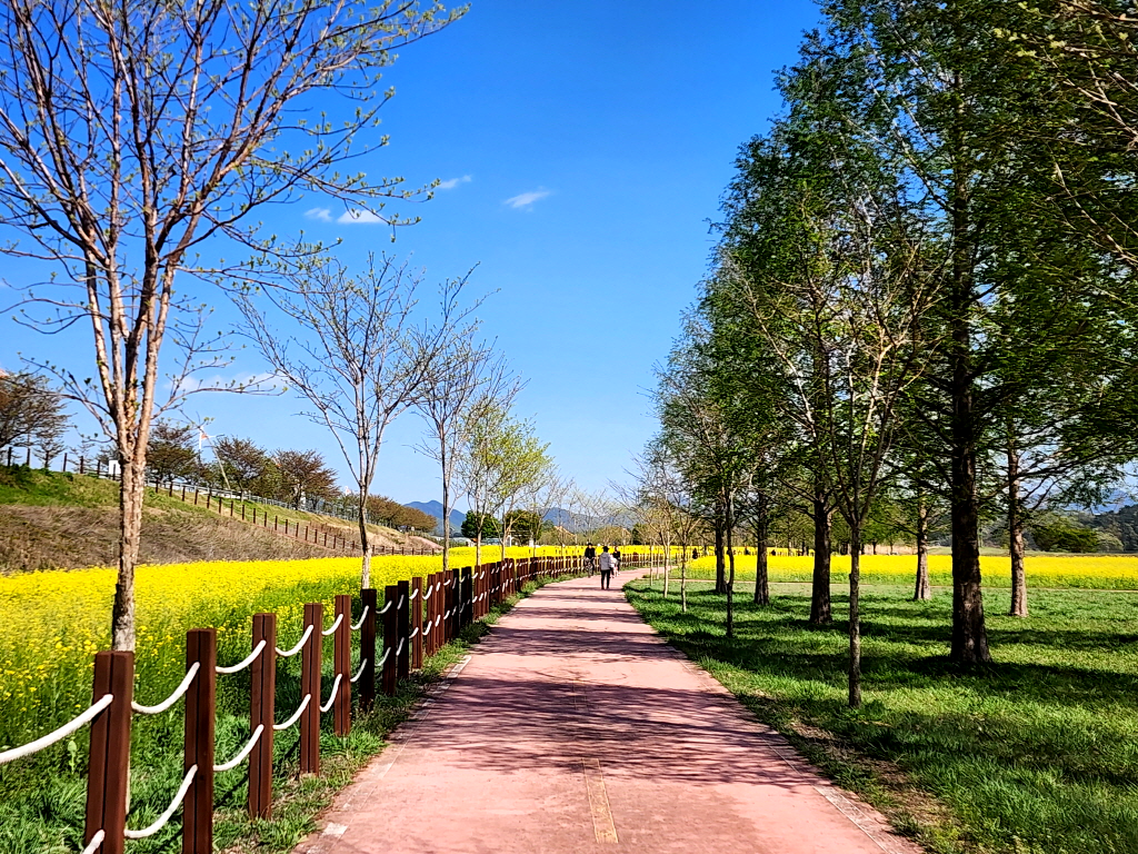 다음 행선지는 창녕 남지의 유채꽃밭이다. 33만 평의 드넓은 곳에 노란 유채꽃이 펼쳐져 있었다. 전국에서 단일 면적 최대 규모라고 한다. 축제는 전날 끝났지만 주말이라 구경 온 사람들이 많았고 먹거리 장터가 있어 축제의 흥겨움도 남아 있었다. 끝이 보이지 않는 유채꽃밭은 낙동강의 절경과 어우러져 한 폭의 수채화 같았다. 내 맘속에 저장만 하고 오기엔 아까운 풍경들을 열심히 휴대폰에 담았다. 위쪽으로 한참 걸어가면 형형색색의 튤립 꽃밭이 나온다는데 아쉽게도 그곳까지 가기엔 시간이 부족했다. 모두들 오랜만의 나들이에 눈 호강도 하고 정자에 앉아 도란도란 삼 년 묵은 얘기들을 나누다 보니 하루가 금방 지났다.