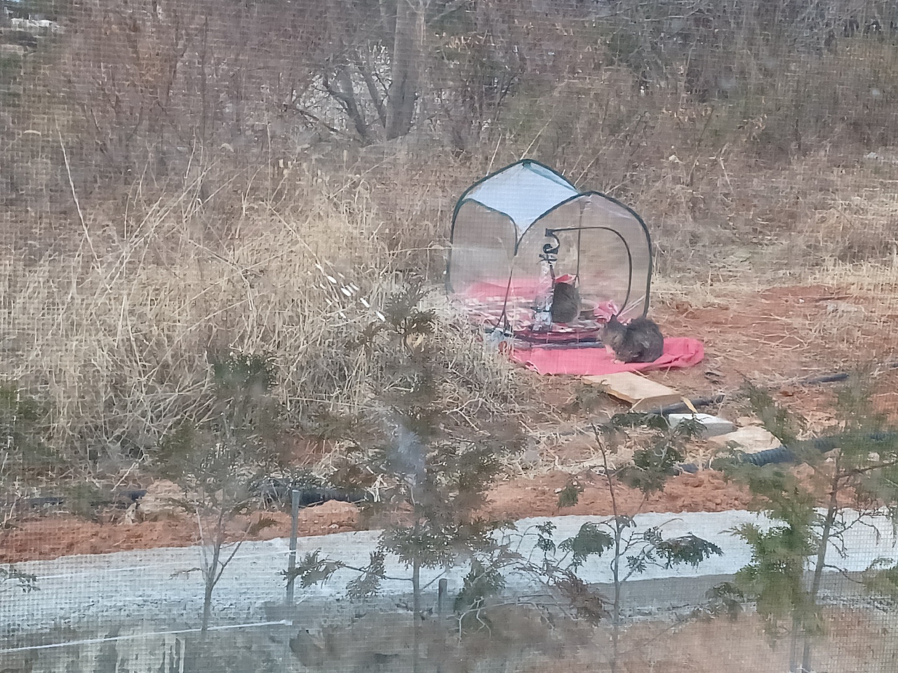 고양이들이 하숙집처럼 이용하던 투명 하우스를 또 강제 이주시켜야 한다. 그동안 차고에서 지내던 반려견 두강의 집을 뒷마당에 짓기로 했다. 장소가 마땅치 않아 아무리 고민해봐도 답이 없어 결국 냥이들의 투명 하우스를 옮기기로 결정했다. 그동안 다용도실 바깥 출입문으로 드나들 수 있어 여러모로 편했는데 아쉽다.