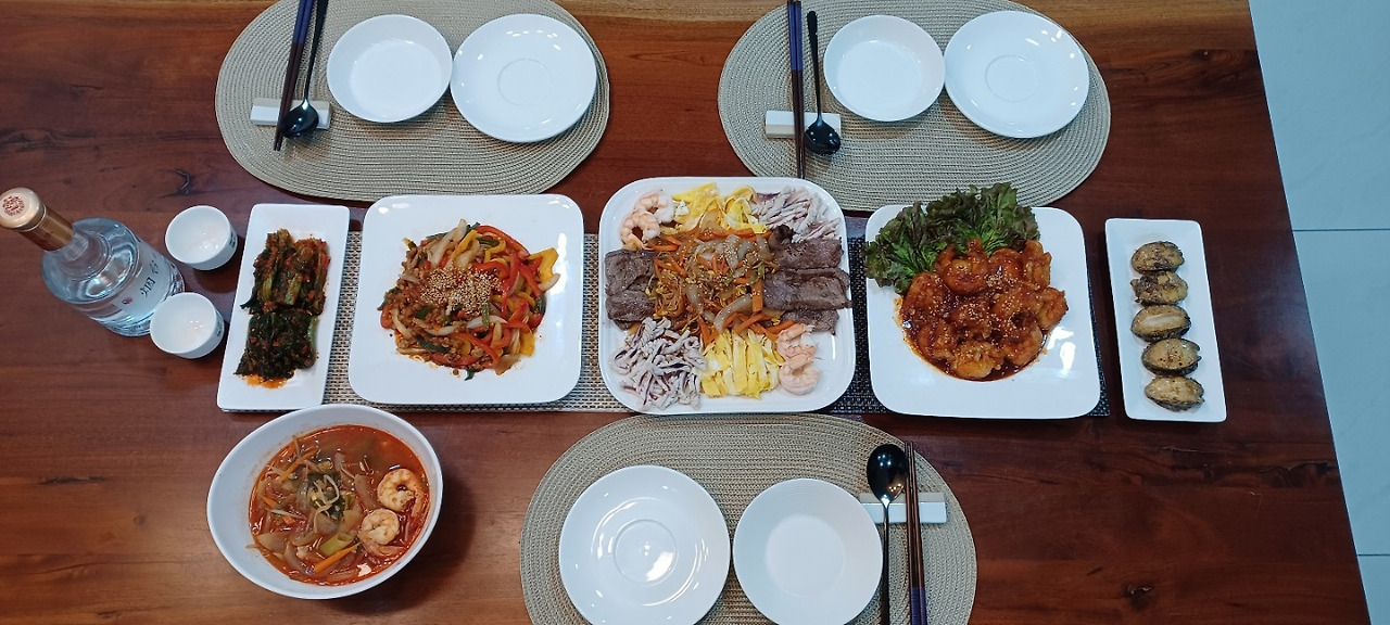 여름 못지않게 더운 날씨였다. 덩치 큰 아들은 연신 땀을 훔치면서도 정확하고 빠르게 움직였다. 어느새 고기와 야채를 볶아 겨자소스를 곁들인 아들표 양장피 사촌(피가 없음.ㅎㅎ)이 완성됐다. 매콤한 고추잡채도 뚝딱, 전분가루 입혀 두 번 튀겨낸 새우에 새콤달콤한 소스 버무린 칠리 새우는 명품이었다. 고소한 전복 버터구이, 게다가 아빠가 좋아하는 오징어와 새우에 야채 듬뿍 넣어 매콤 칼칼하고 시원한 짬뽕까지 끓여 냈다. 중국식 코스 요리 못지않았다. 그전까지의 아들 음식은 맛은 있지만 젊은이들 입맛이라 다소 간이 센 편이었다. 이번엔 우리를 위해 자극적이지 않고 부담 없는 맛이었다.