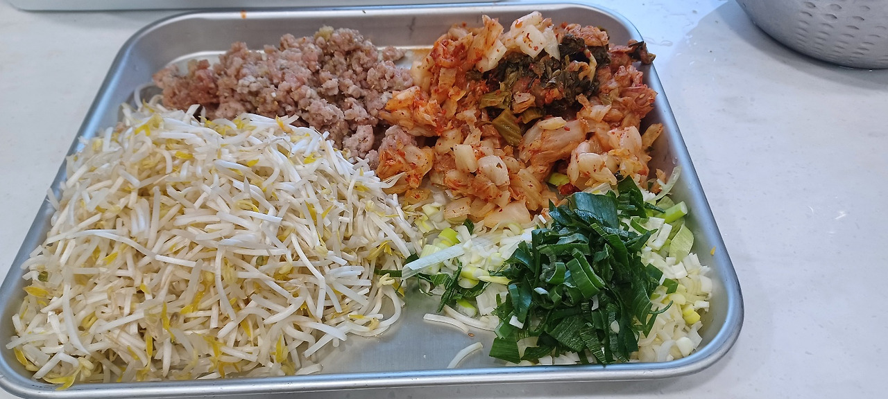 재료 : 녹두 1컵, 찹쌀가루(멥쌀가루) 3큰술, 부침가루 5큰술, 물 1컵(200ml), 신 김치 100g, 간 돼지고기 200g, 숙주 100g,