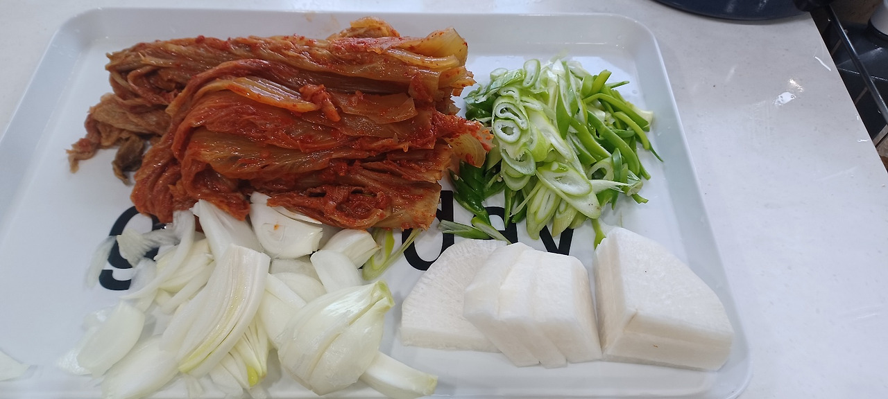 생물 고등어 2마리, 묵은지 반포기, 무 300g, 대파 1대, 양파 반 개, 청양고추 2개