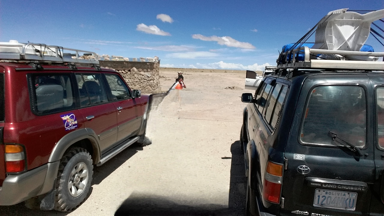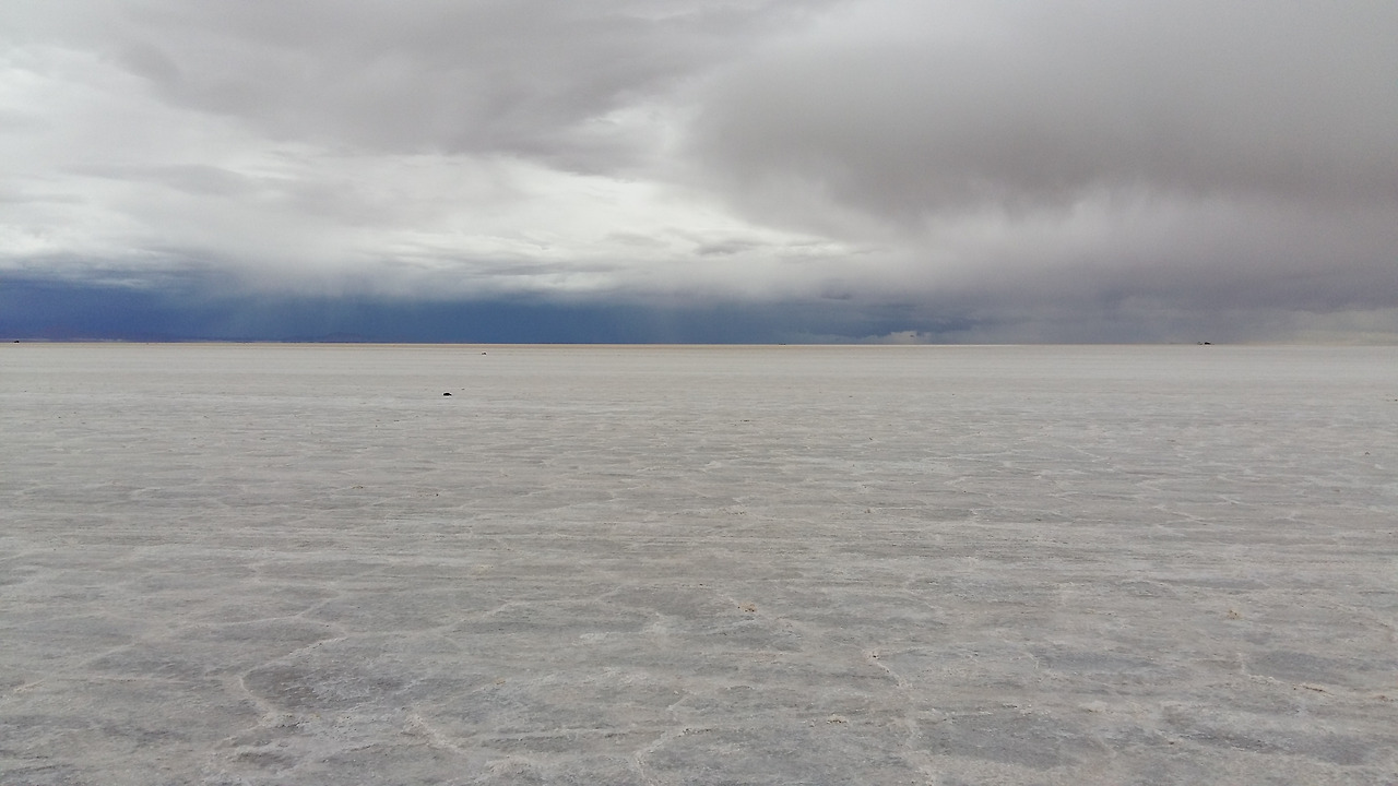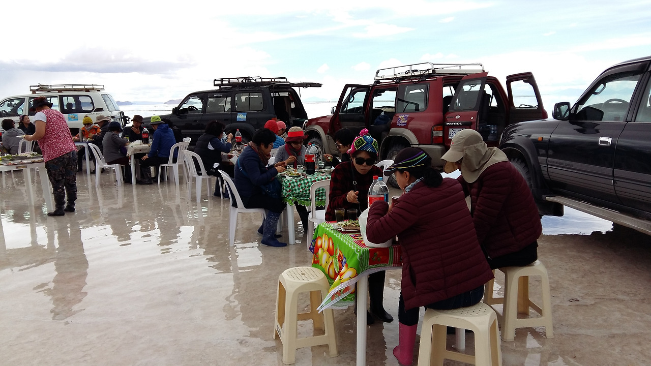 한참 사진을 찍고 있는데 반대편 하늘이 심상치 않았다. 시커먼 구름이 뒤덮어 곧 비가 쏟아질 것 같았다. 우리는 소금 사막 위에서 4륜구동의 기사들이 현지에서 바로 준비해 준 식사를 했는데 식사를 마칠 즈음 비가 쏟아졌다. 하마터면, 로망을 실현하지 못하고 갈 뻔했으니 하늘이 도왔다고 할 수밖에.