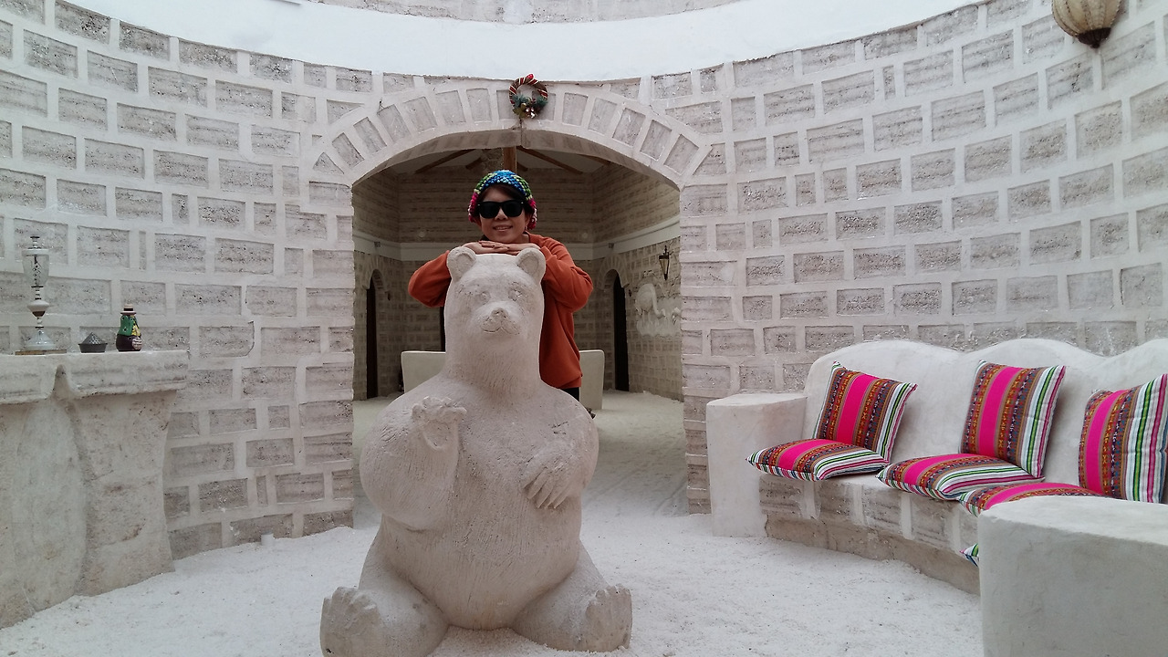 다음 행선지는 오늘의 숙소 소금호텔이다. 소금호텔은 벽, 바닥, 탁자, 의자 조형물등이 모두 소금으로 이루어져 있다. 암염으로 만들어진 벽과 장식품들이 정말 소금인지 손가락으로 슬쩍 찍어 맛을 보니 역시 짰다. 어떻게 소금으로 집을 짓고 이것을 관광상품으로 개발할 생각을 했는지 참 대단하다 싶다.