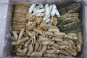 나의 최애 과자 이브콘, 오란다, 꽈배기부터 담고 남편이 좋아하는 전병도 얹는다.