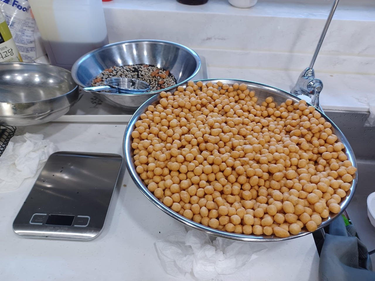 재료 : 알알이 160~170g, 버터 또는 식용유 20g, 올리고당 25g, 조청(물엿) 75g,