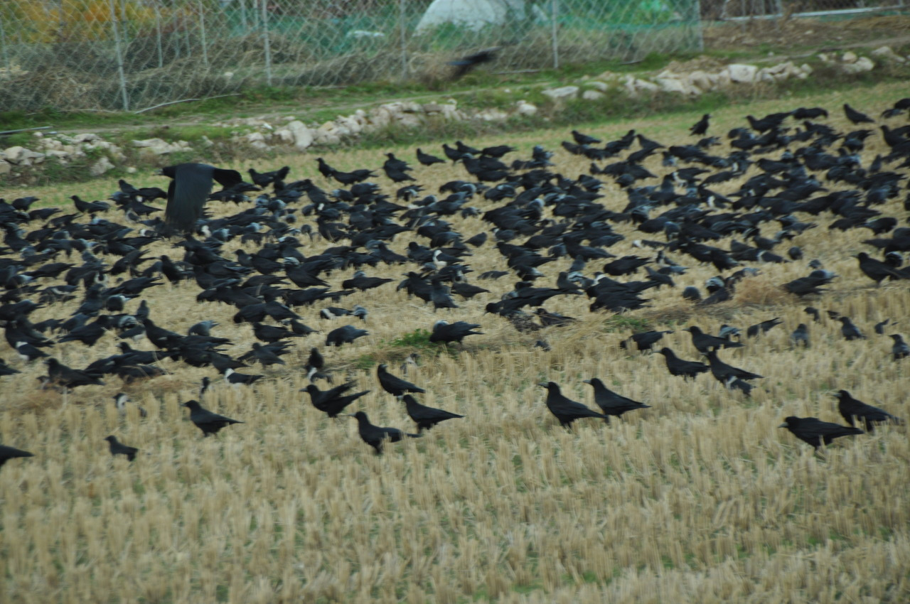 맙소사! 우리 집 마당 위로 떼까마귀 수백 마리가 지나가고 있었다. 넋을 놓고 바라보다 급히 휴대폰을 가지러 갔지만 늦었다. 새들은 이미 동네 앞 논바닥으로 내려앉은 뒤였다. 동네 어귀의 전깃줄에, 추수가 끝난 논바닥에 앉은 까마귀 떼를 여러 차례 보았지만 이렇게 내 집 마당 위를 날아간 것은 처음이다. 귀한 장면을 놓친 것이 못내 아쉬웠다.