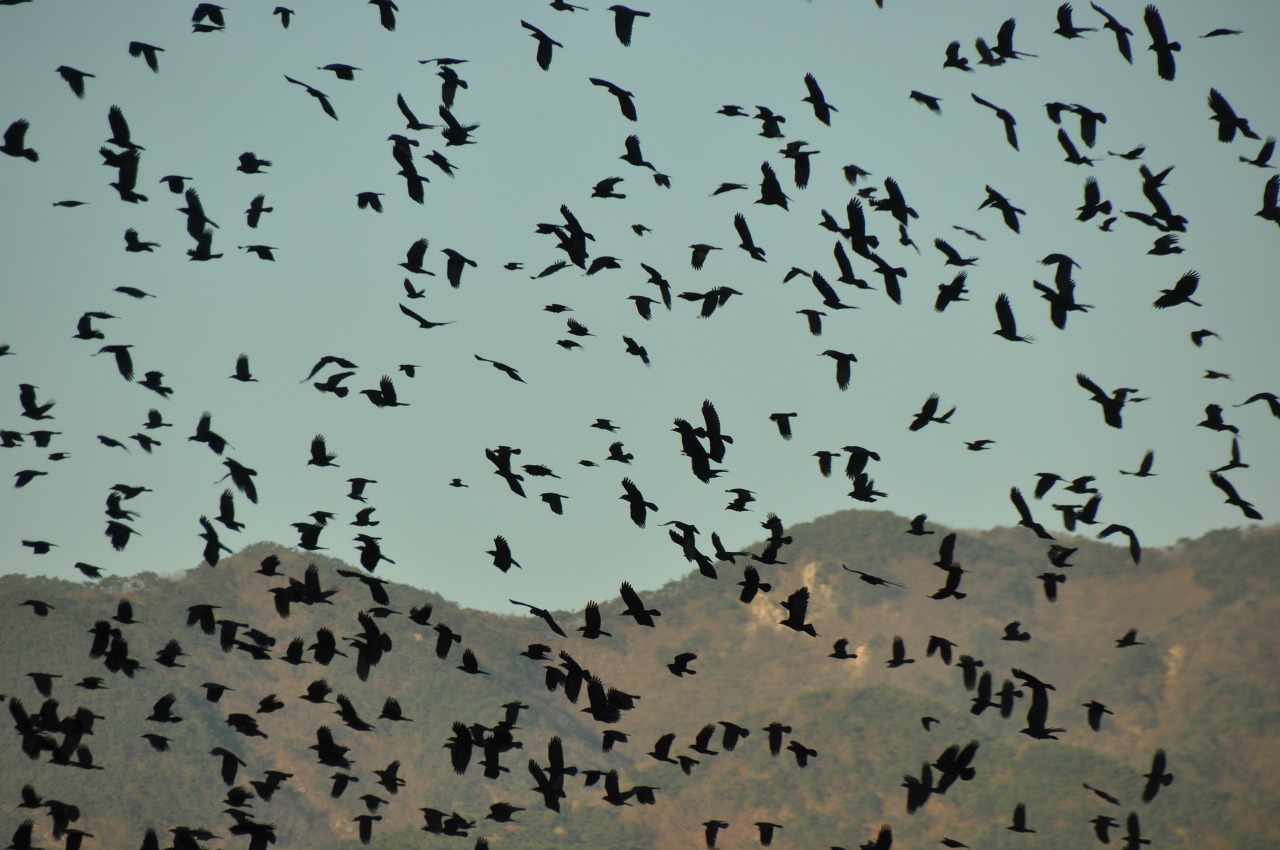 해가 서서히 서쪽으로 기울면서 붉은 노을을 따라 한 무리씩 모여들었다. 붉은 기운과 푸른 기운이 펼쳐진 하늘 위로 떼까마귀의 화려한 군무가 드디어 시작되었다. 해가 산등성이로 넘어가고 빛이 사그라지는 순간 사방에서 검은 무리가 수도 없이 몰려들었다. 검은 하늘, 검은 산을 배경으로 검은 새가 춤을 추었다. 우리는 검은 새떼의 황홀한 군무를 넋을 놓고 바라보았다