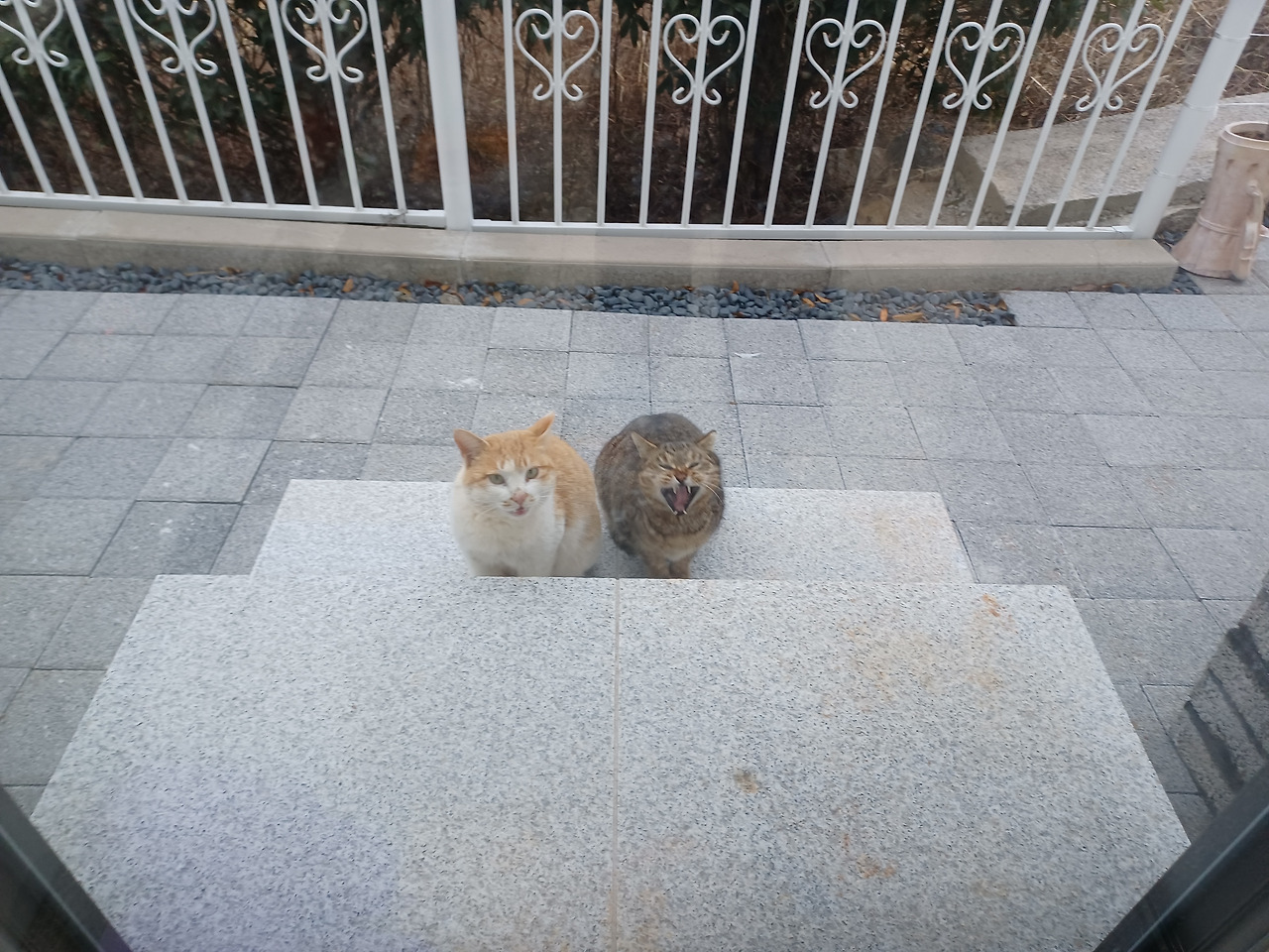 희한하게도 처음엔 노란 무늬 고양이와 회색 고양이가 며칠씩 번갈아 찾아왔다.