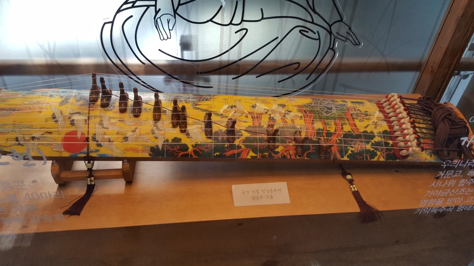 갓을 쓴 김창조 선생의 흉상이 지키는 산조기념관으로 들어서자 화려한 화각 가야금(12현)이 눈길을 사로잡는다. 국가무형문화재 42호 악기장 고흥곤 씨와 화각장인 이재만 씨가 소 40마리의 뿔과 순금 2돈으로 제작한 명작. 우리나라의 유일한 화각 가야금으로 가야금 산조 및 병창 보유자 양승희 씨가 기증했다.