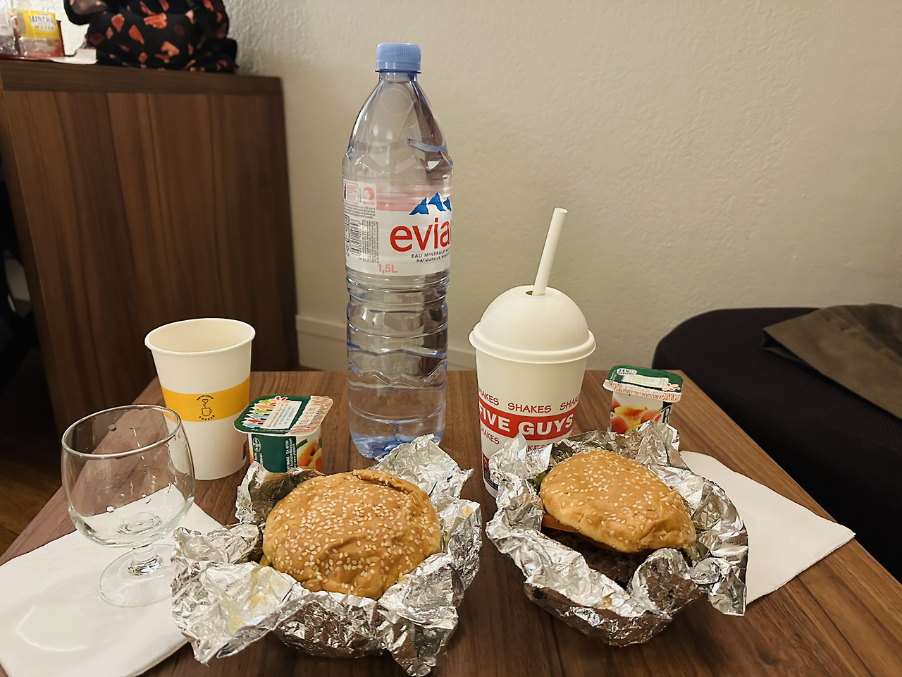 미식 여행도 사실 계획 중 하나였지만 오늘도 그 계획은 완성하지 못했다. 만 오천보를 활보하였더니 일단은 숙소에 들어가 좀 쉬어야겠다. 오후 해는 저물고 블루 파리가 되는 순간, 우리는 동네 마실 겸 어슬렁 거리다 파이브 가이즈서 모든 토핑 다 때려 넣은 버거 두 개와 밀크 셰이크 한 잔을 테이크 아웃하고, 커피 맛 집이라 소문난 숙소 로비에서 공짜 룽고 한 잔을 내려와 저녁을 먹었다. 버거의 높이가 어마해서 이건 뭐 식사 예절을 지킬 수가 없다. 수빈이랑 매장서 먹지 않길 참 잘했다며 세상 제일 맛있었던 버거를 해체하듯 먹어치웠다.