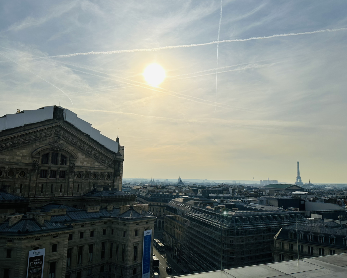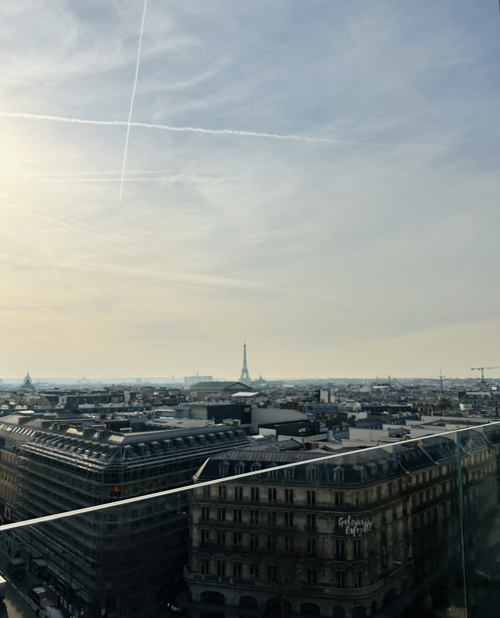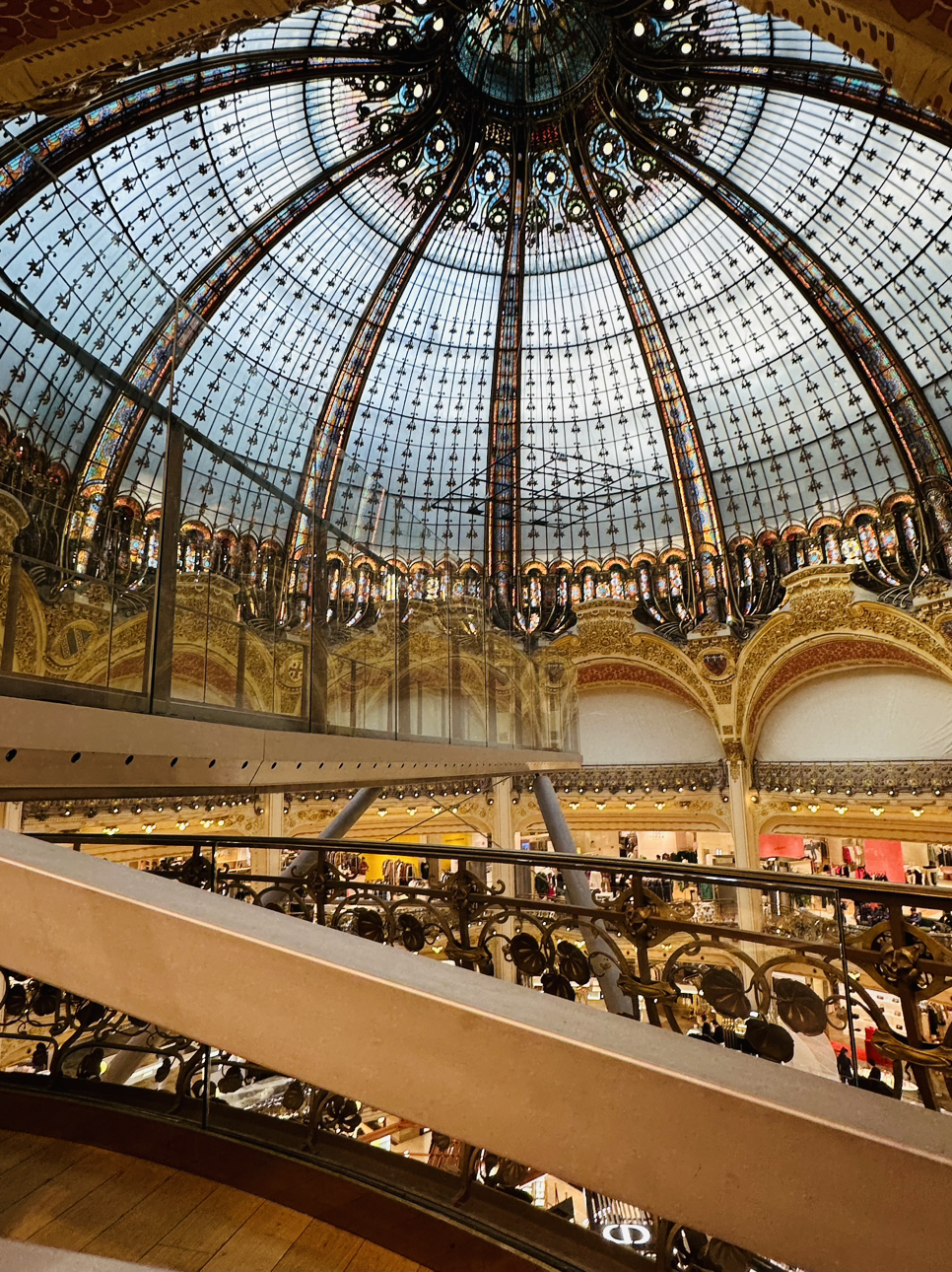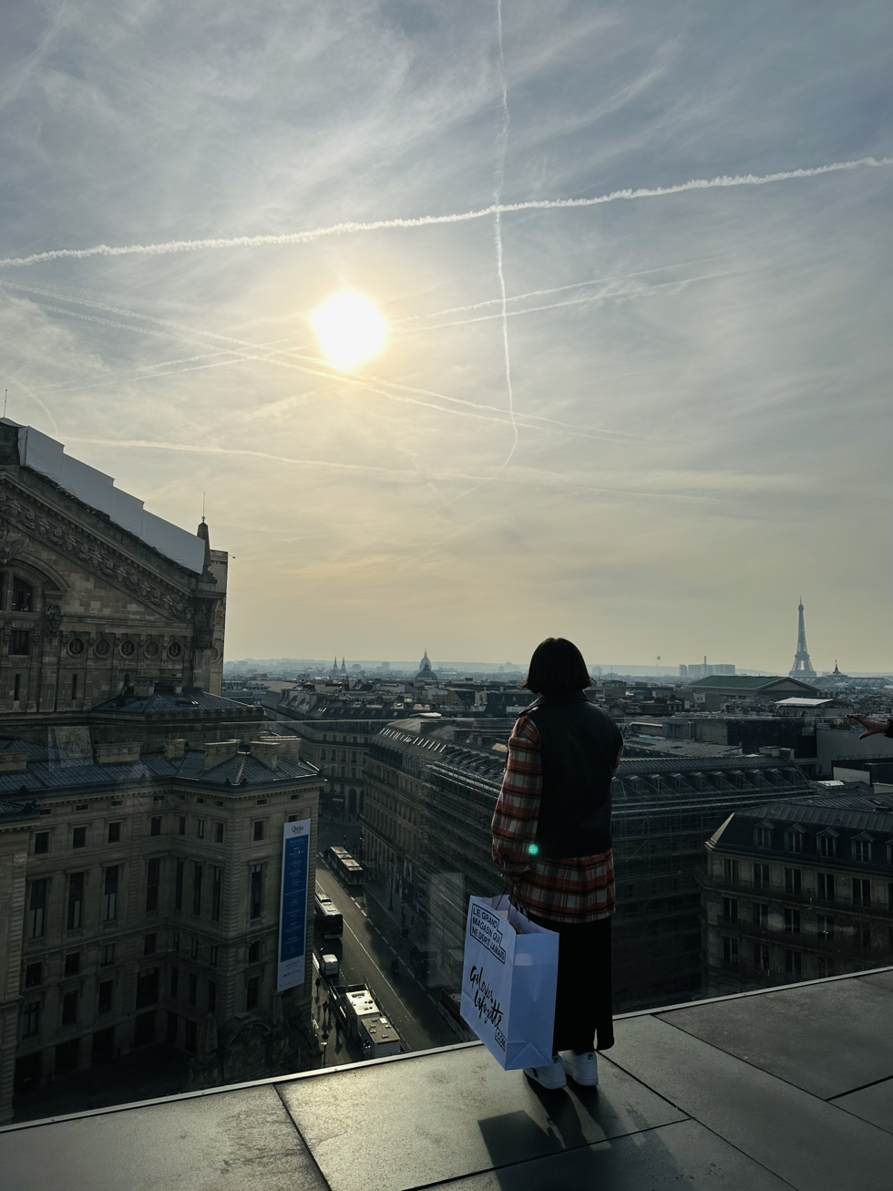 이젠 라파예뜨를 찾은 두 번째 목적이다. 고개를 들어 돔 천장을 보라. 환상적이고 이국적인 돔 내부가 우리 머리 위에 있다. 다음은 파리 시내를 내려다보러 가자. 엘리베이터로 이동하고 에스켈러이터로 갈아타고 루프탑 입구를 향해 서서히 오르면 파리 시내도 서서히 보이기 시작한다. 바로 앞 오페라 극장도 보이고 저 멀리 에펠탑도 보이고, 고소공포증이 있음에도 선뜻 함께 해준 우리 수빈이에게 참 고마웠다.