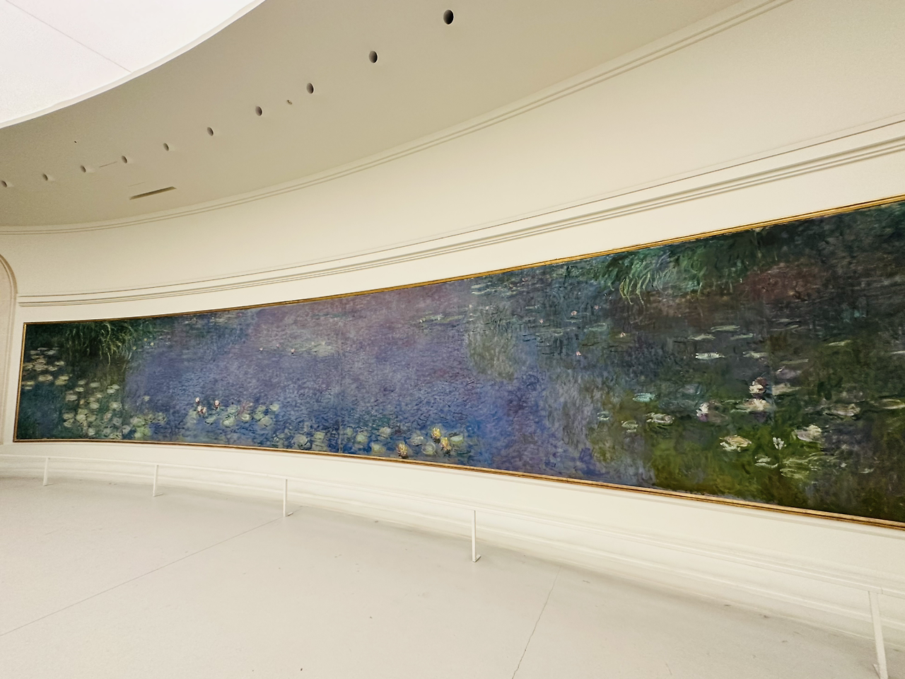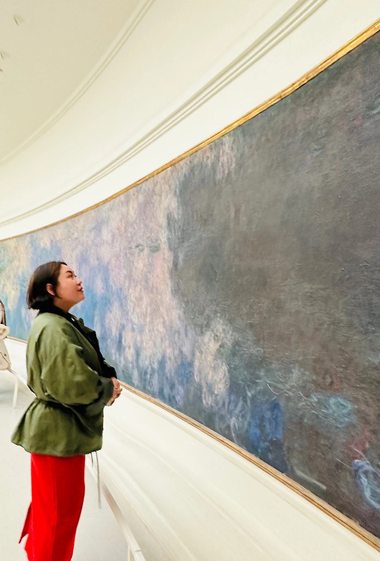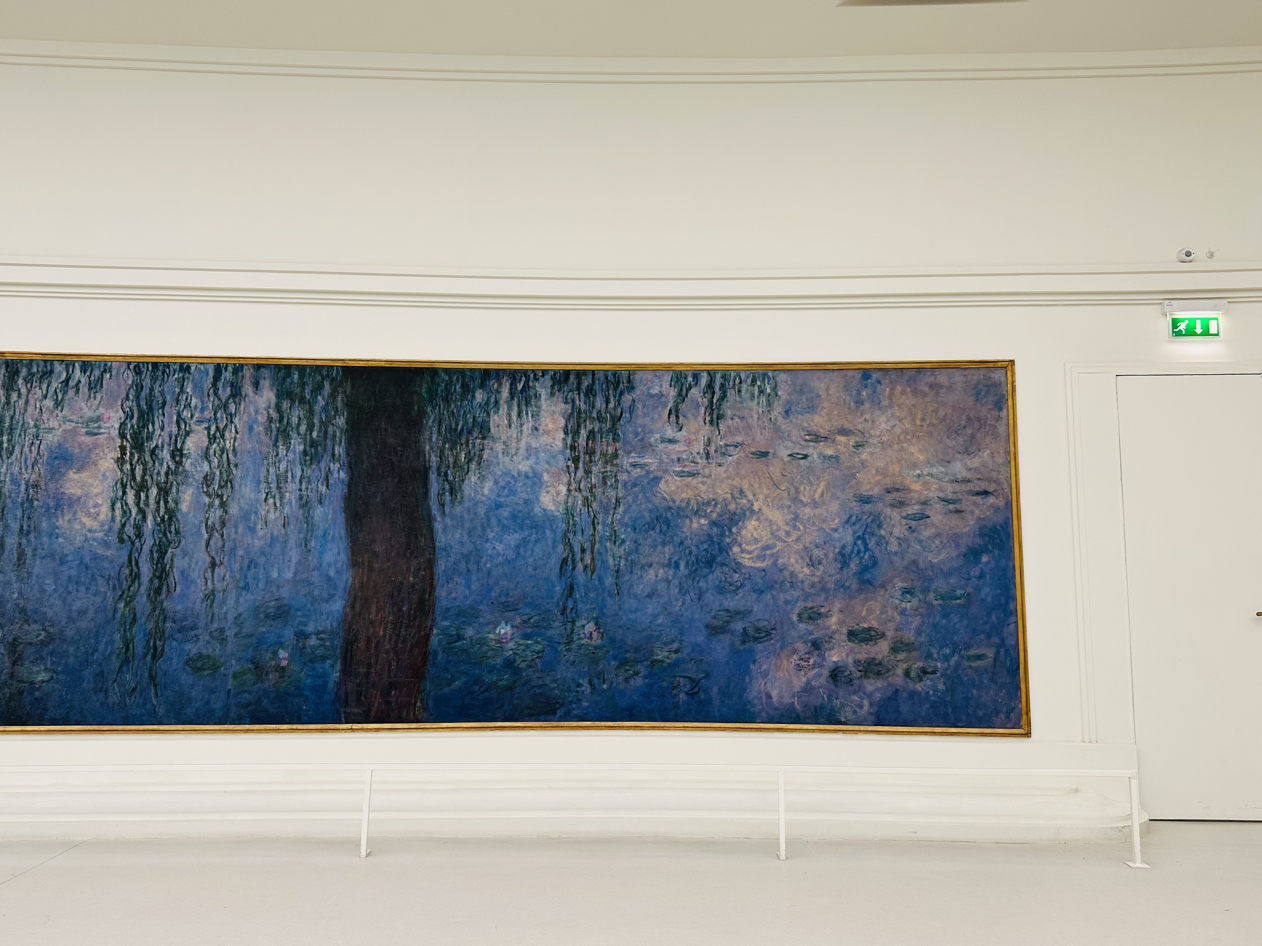 모네는 수련 연작을 기증하며, 흰 벽에 타원으로 그림을 걸고, 자연광 아래에서 그림을 볼 수 있길 원했다고 한다. 거대한 수련 작품은, 파노라마를 보듯 일단 내 몸을 돌려가며 감상한다. 매직 아이를 보듯 눈을 살짝 찡그리기도 하고, 눈을 다 뜨고 보기도 하며, 멀리서도 봤다가, 가장 까까운 곳까지 보기도 하고, 전체를 보았다가, 부분만을 보기도 한다. 마치 내가 지금 지베르니의 그의 정원에 있는 듯 하다. 천장에서는 은은한 태양빛이 들어오고, 변하는 태양의 위치에 따라 영원한 것은 없다는 듯 같은 방향을 보아도 달라 보이는 하루처럼, 지금의 모네의 그림도 내일의 다른 하늘이라면 어떤 느낌일지 기대된다.
