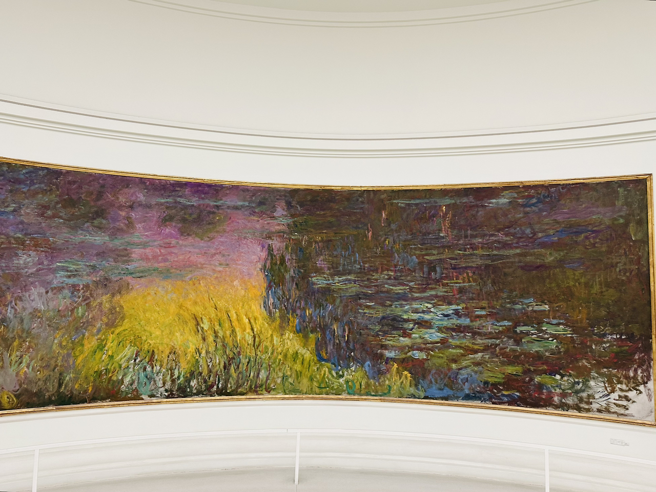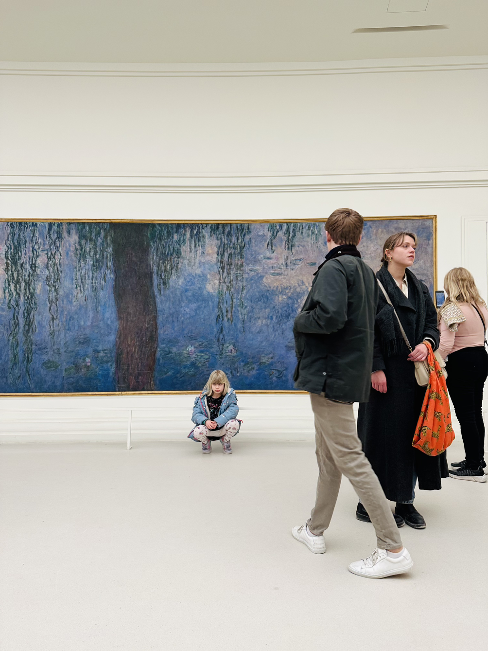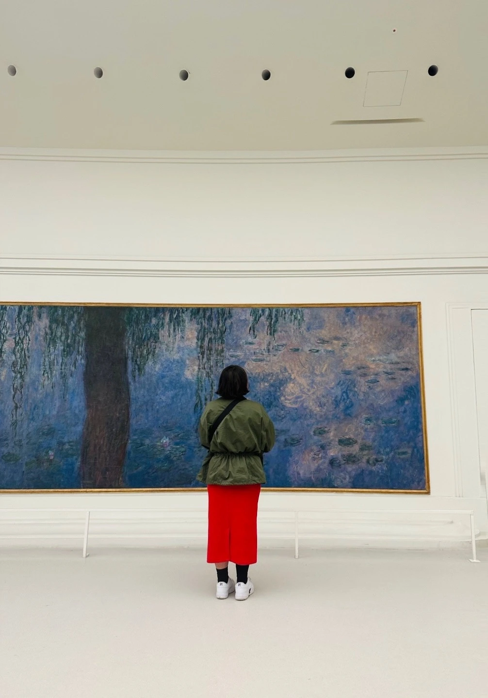 모네는 수련 연작을 기증하며, 흰 벽에 타원으로 그림을 걸고, 자연광 아래에서 그림을 볼 수 있길 원했다고 한다. 거대한 수련 작품은, 파노라마를 보듯 일단 내 몸을 돌려가며 감상한다. 매직 아이를 보듯 눈을 살짝 찡그리기도 하고, 눈을 다 뜨고 보기도 하며, 멀리서도 봤다가, 가장 까까운 곳까지 보기도 하고, 전체를 보았다가, 부분만을 보기도 한다. 마치 내가 지금 지베르니의 그의 정원에 있는 듯 하다. 천장에서는 은은한 태양빛이 들어오고, 변하는 태양의 위치에 따라 영원한 것은 없다는 듯 같은 방향을 보아도 달라 보이는 하루처럼, 지금의 모네의 그림도 내일의 다른 하늘이라면 어떤 느낌일지 기대된다.